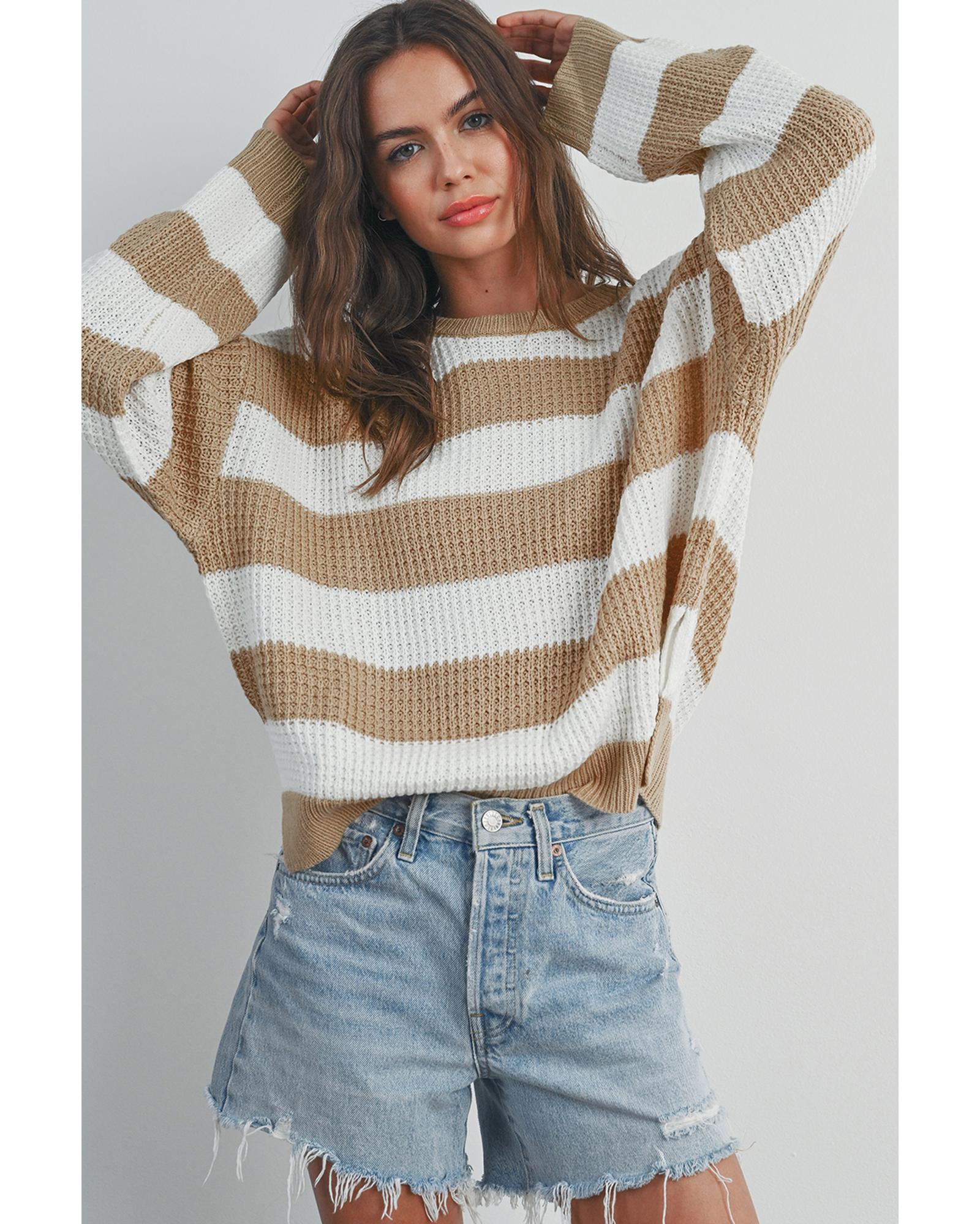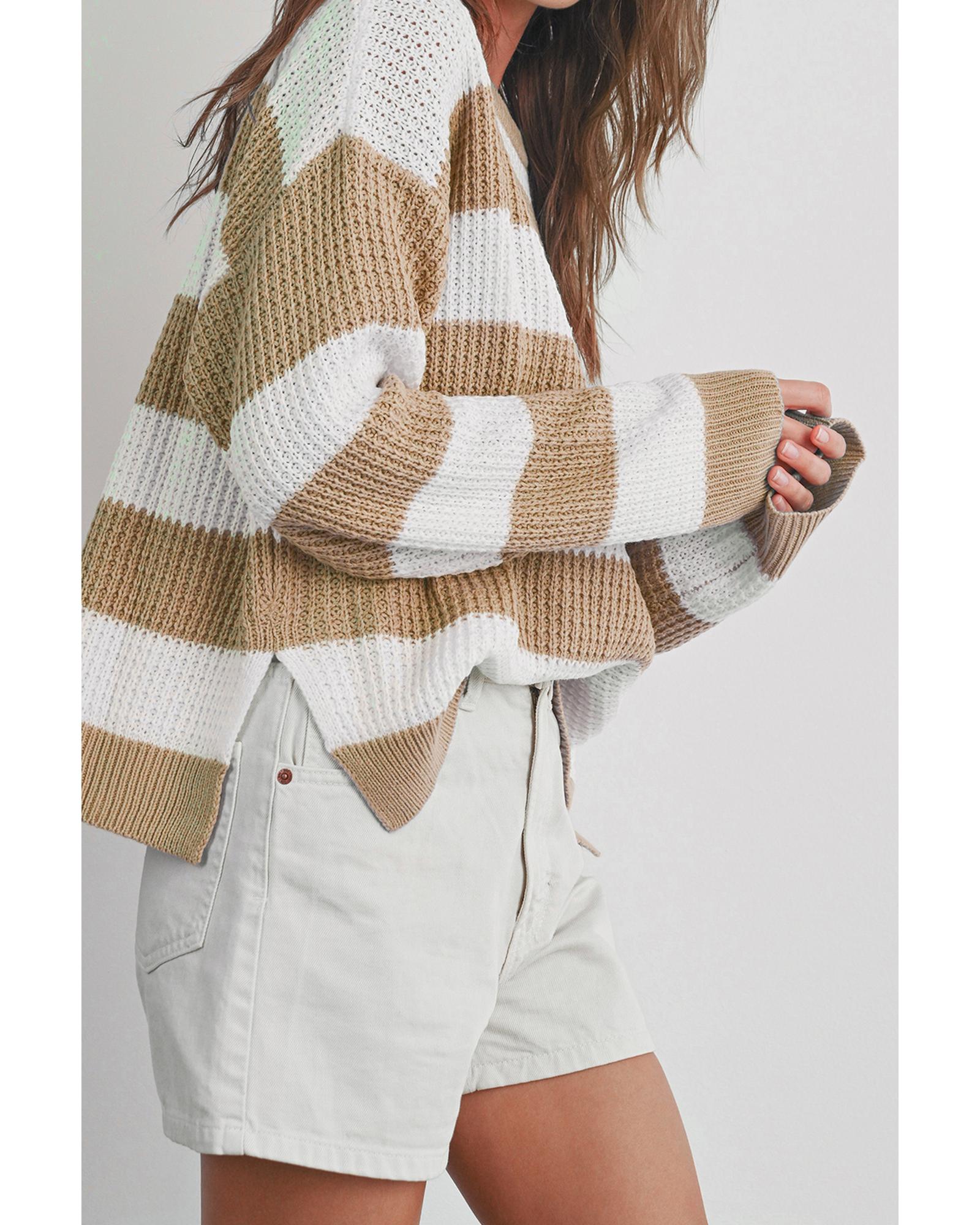 Light French Beige Colorblock Striped Drop Shoulder Side Slit Sweater – S