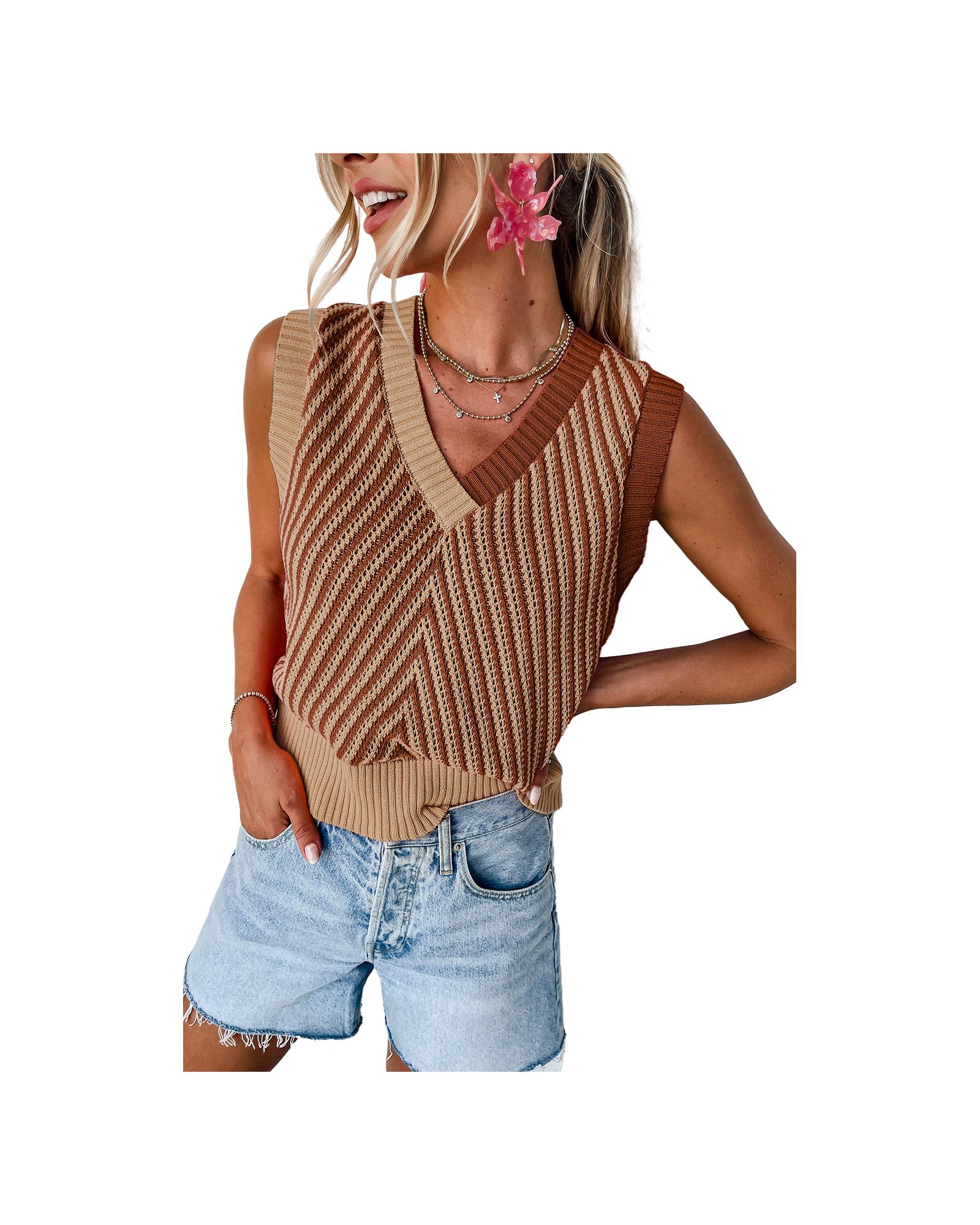 - Light French Beige Contrast Chevron Knit V Neck Sweater Vest