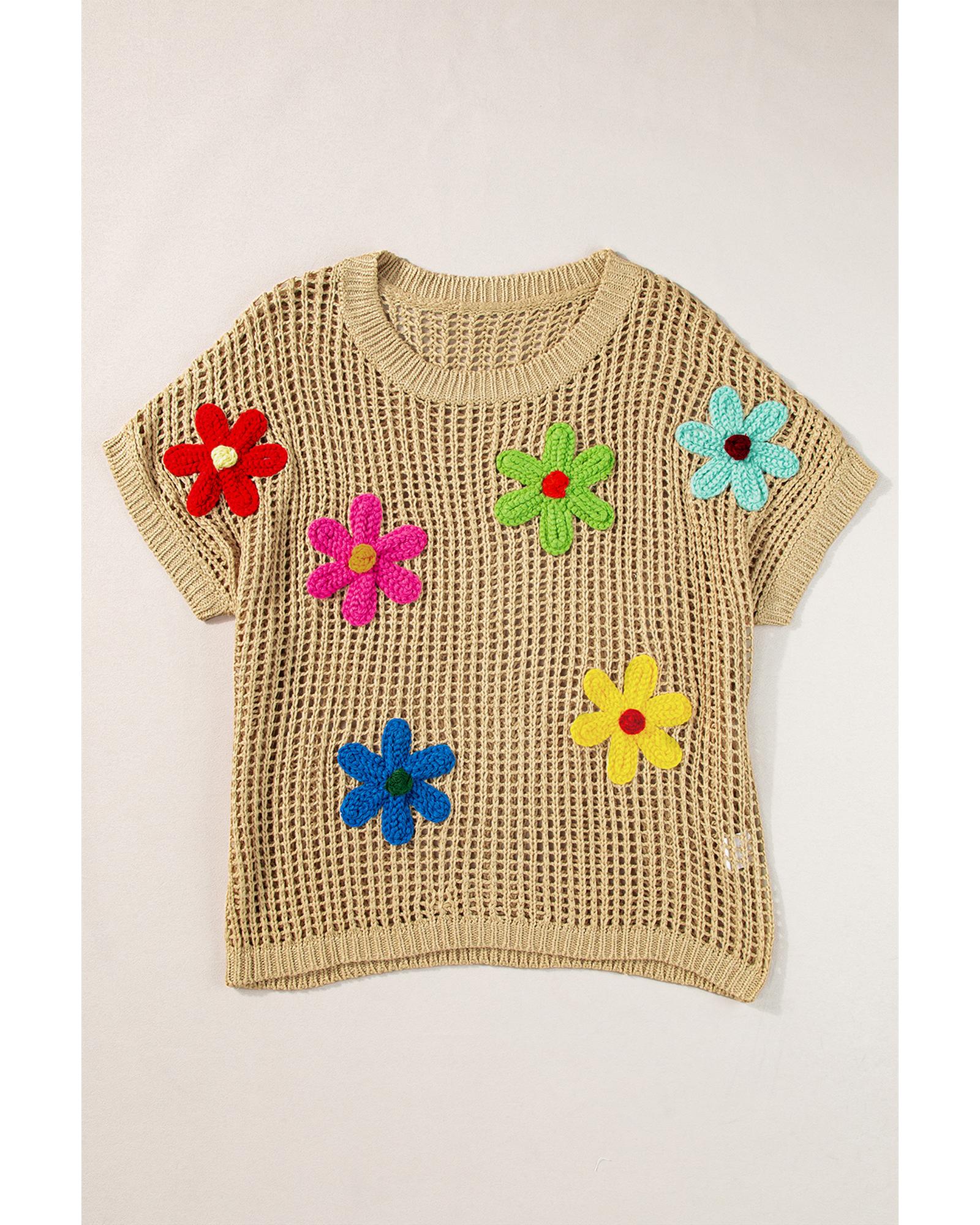 Light French Beige Crochet Flower Hollow-out Sweater T Shirt – L