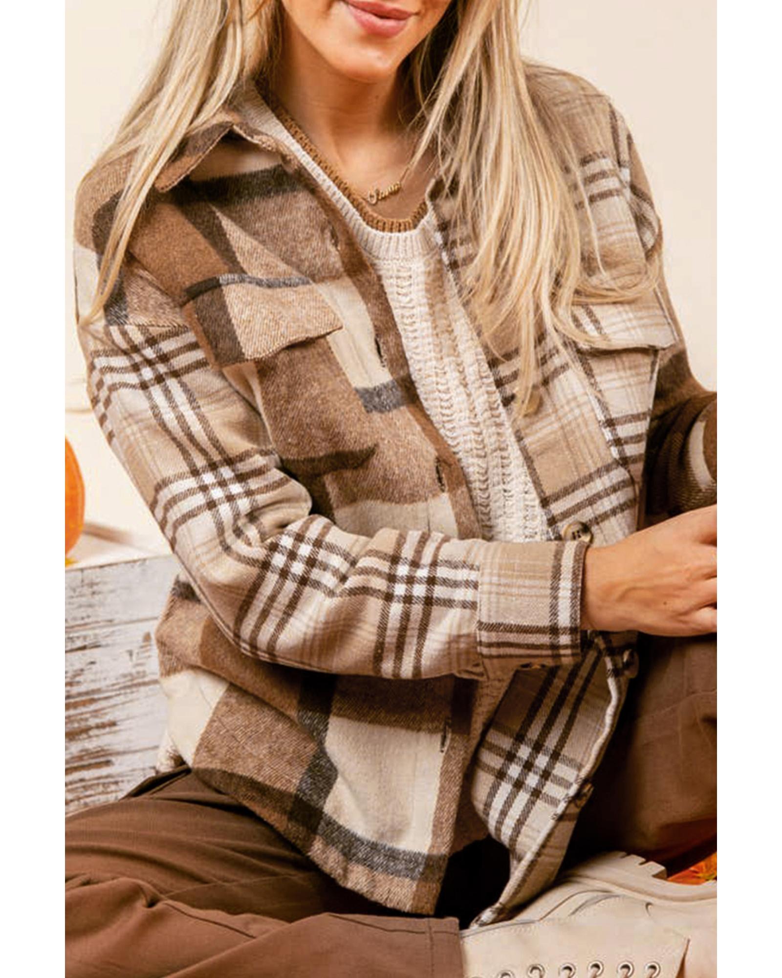 Light French Beige Flannel Plaid Double Flap Pocket Shacket – M