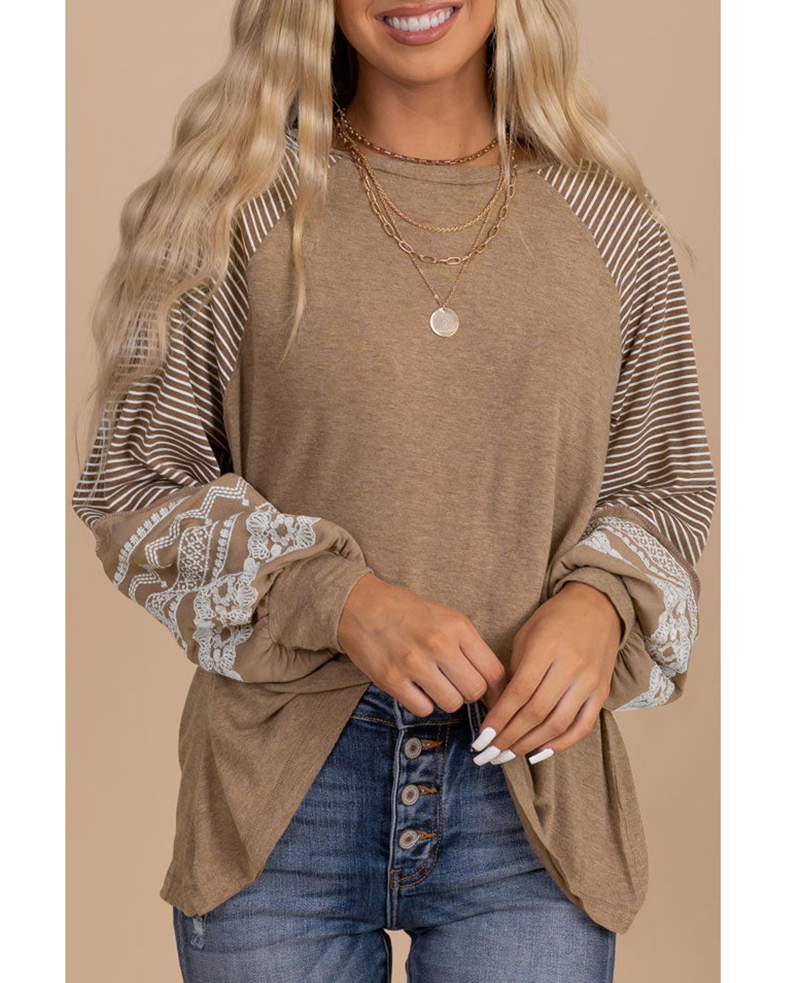 - Light French Beige Floral Striped Patchwork Loose Long Sleeve Top