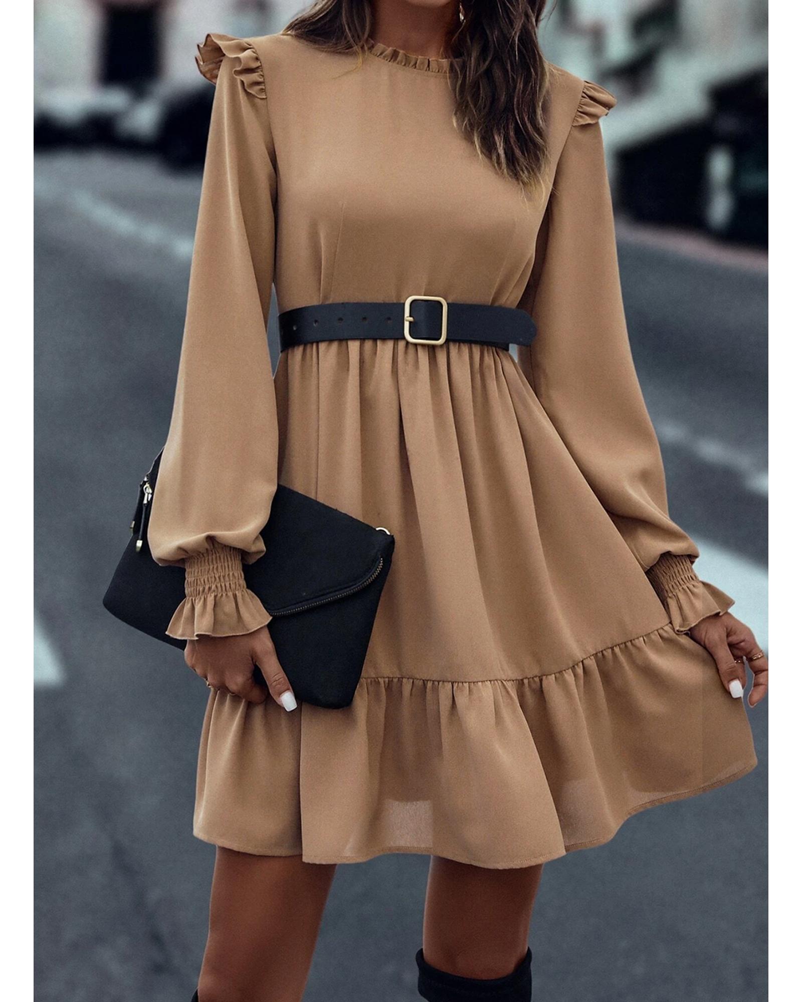 Light French Beige Frilled Collar Ruffled Shoulder Tiered Dress – M