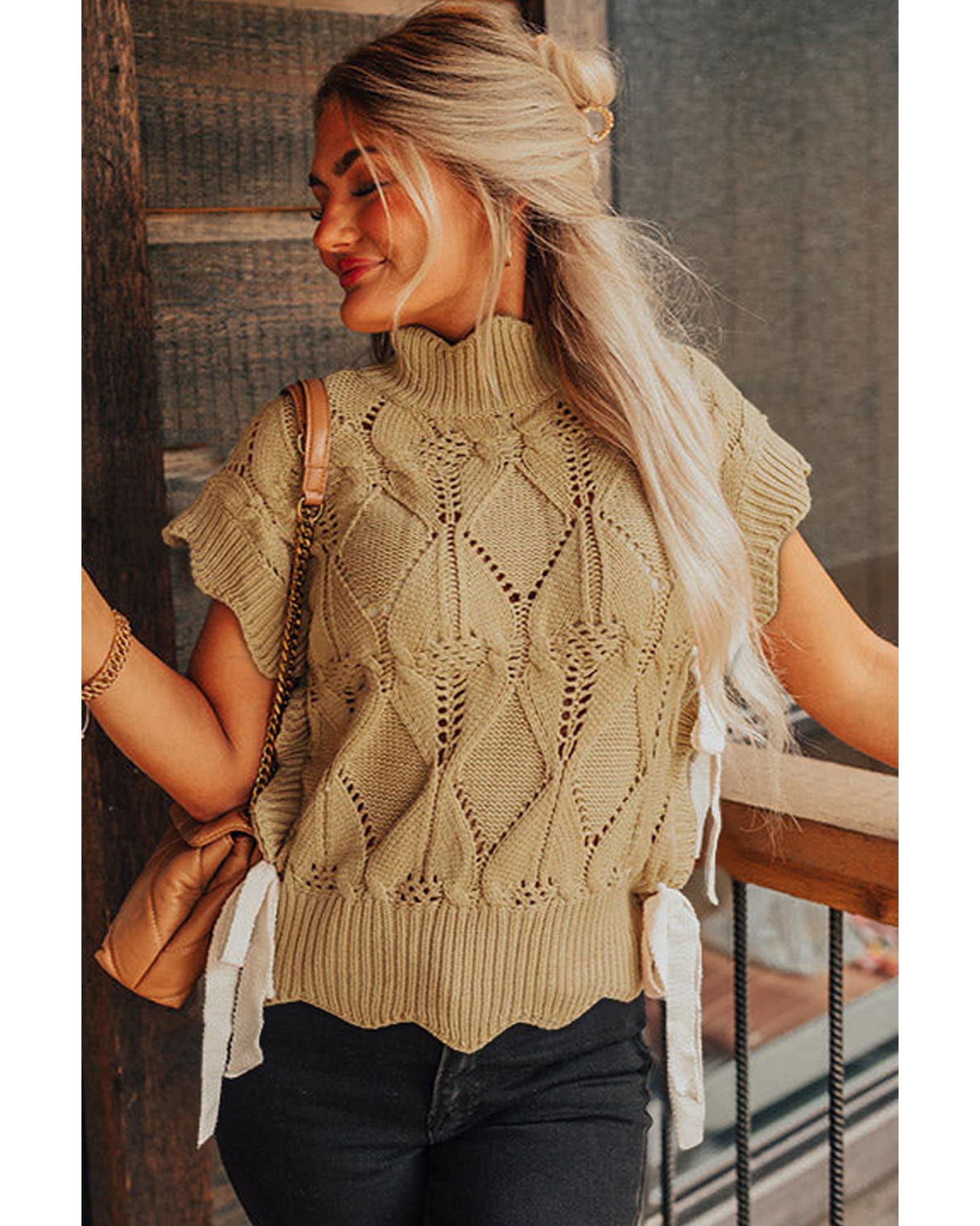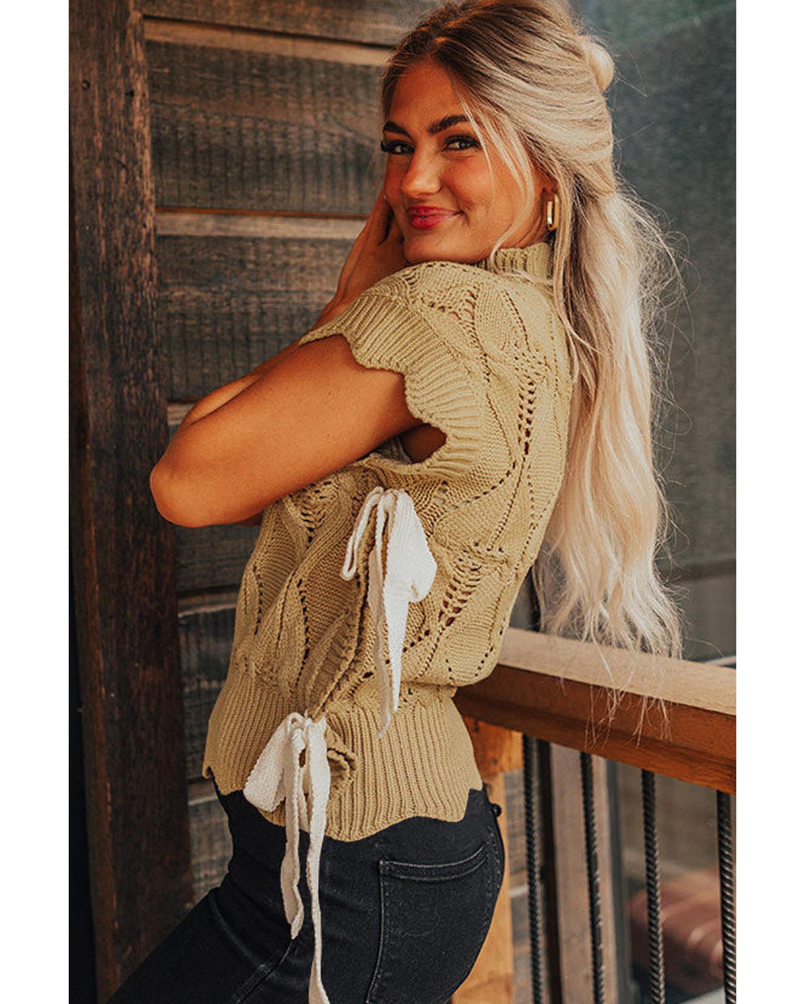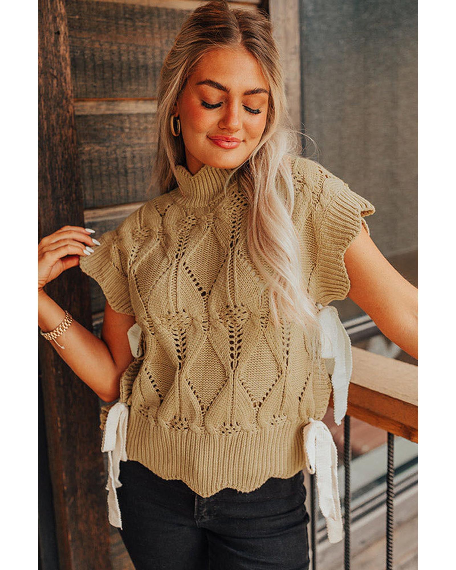 Light French Beige Hollowed Knit Scalloped Trim High Neck Sweater – XL