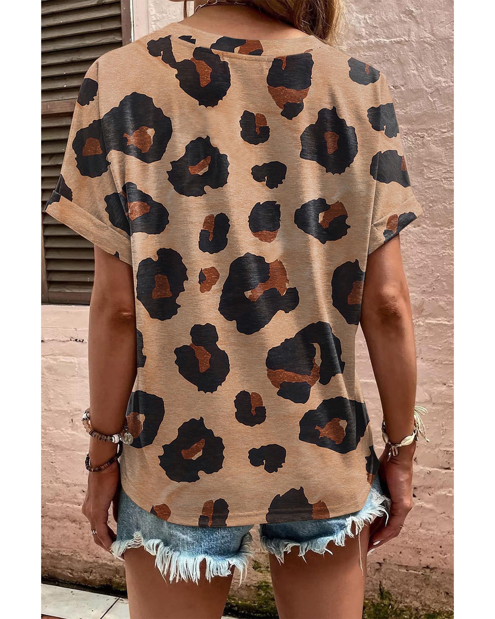 - Light French Beige Leopard Folded Short Sleeve Buttoned V Neck Blouse