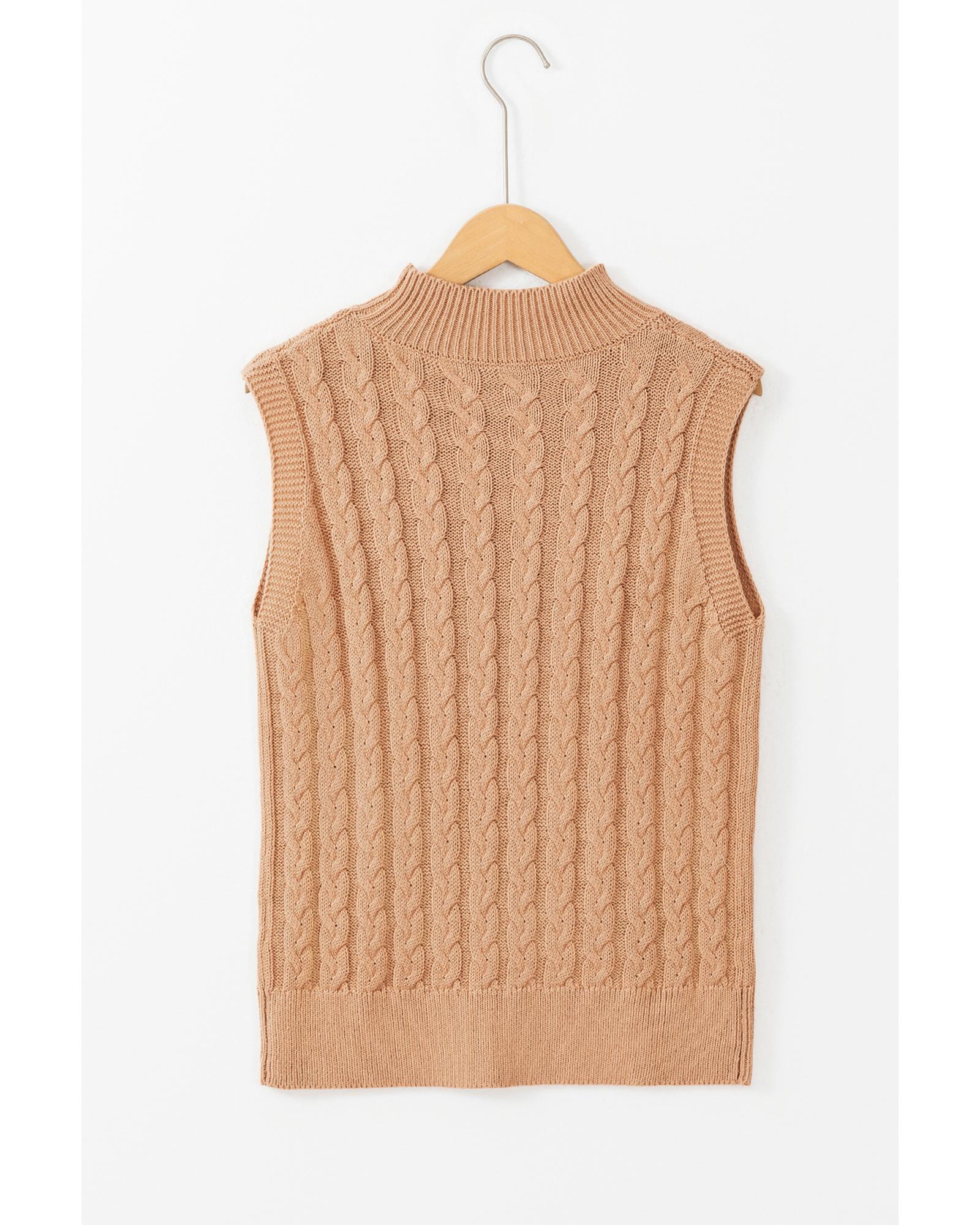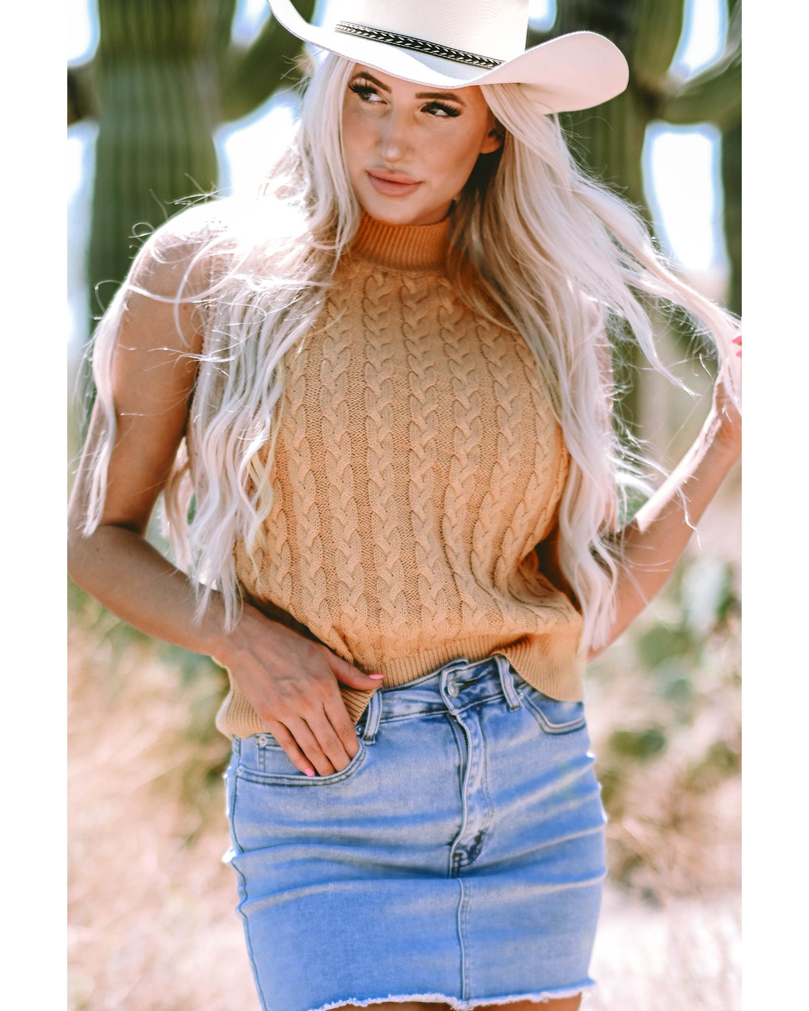 Light French Beige Solid Color Cable Knit High Neck Tank Top – S