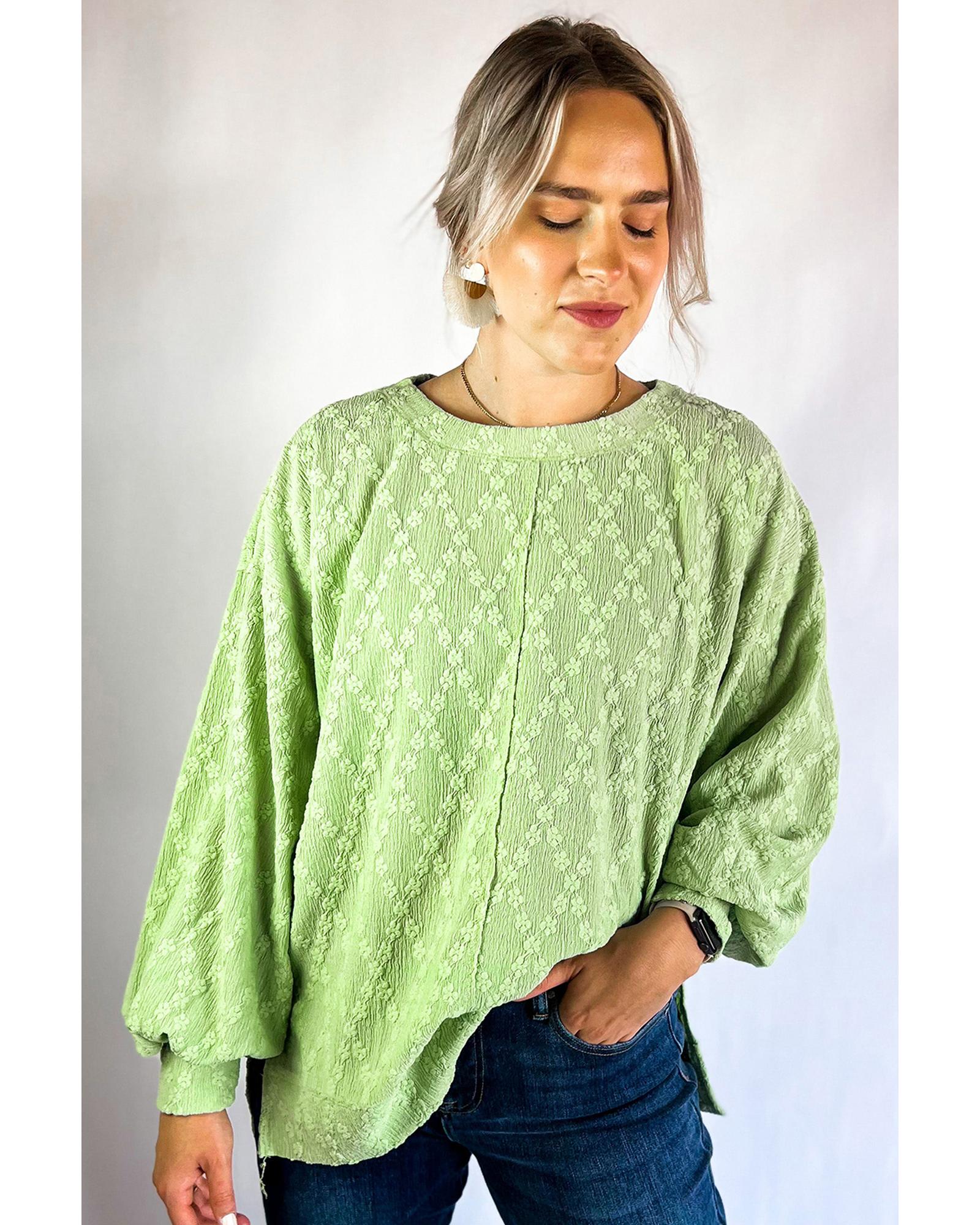 Light Green Solid Color Textured Side Split Crew Neck Blouse – M