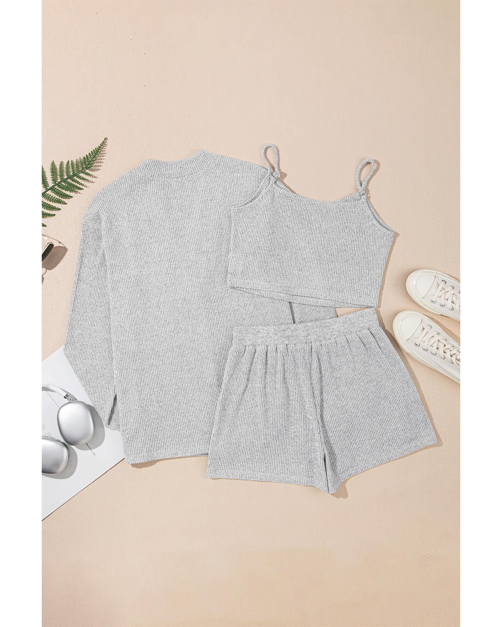 Light Grey 3 Pieces Rib Crop Camisole Matching Shorts Lounge Set with Cardigan – S