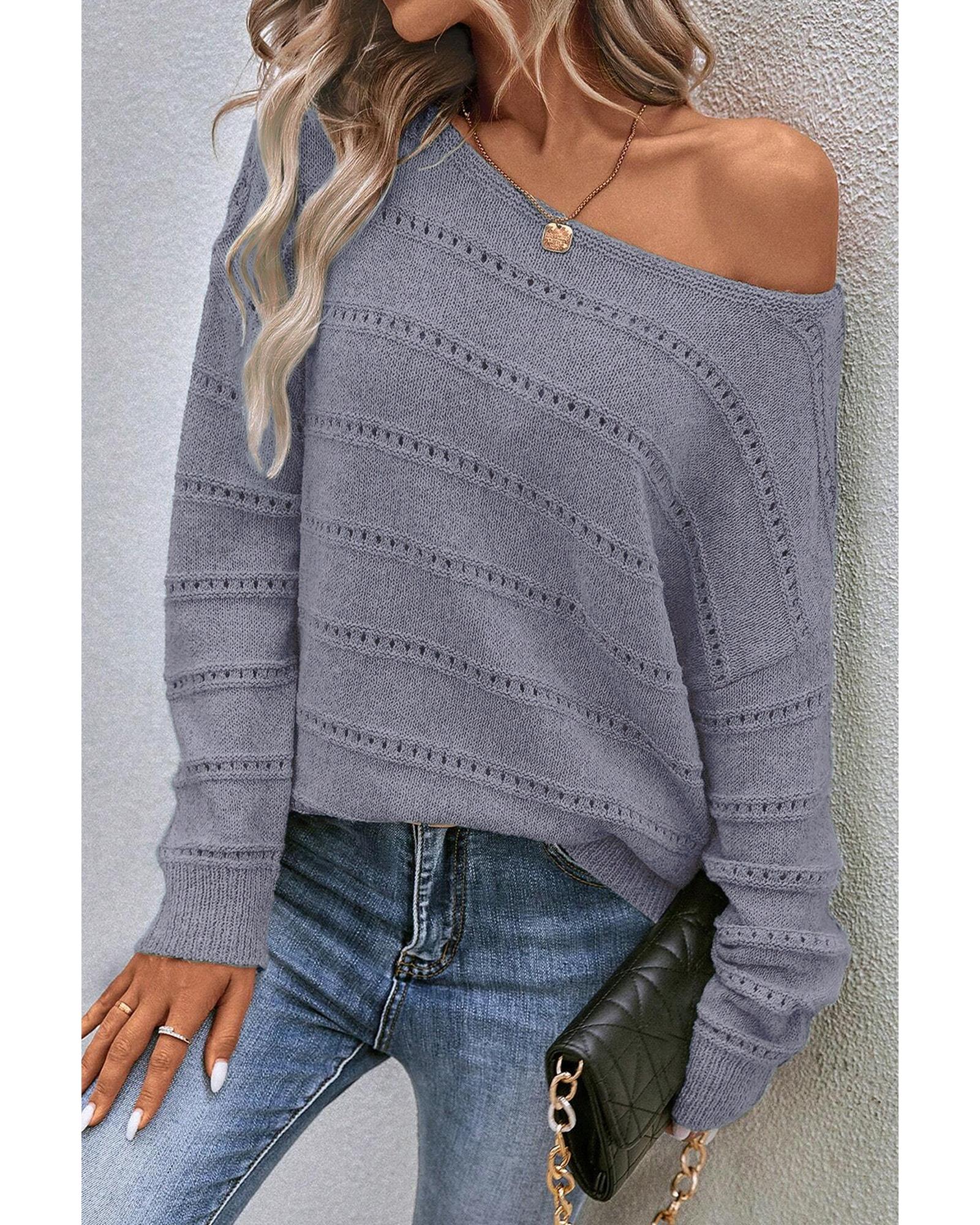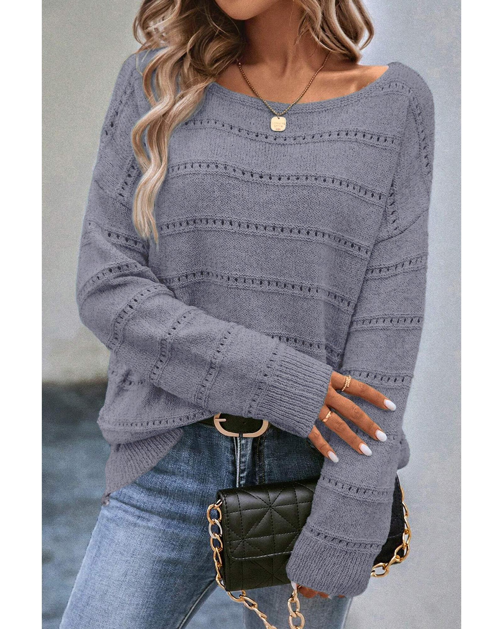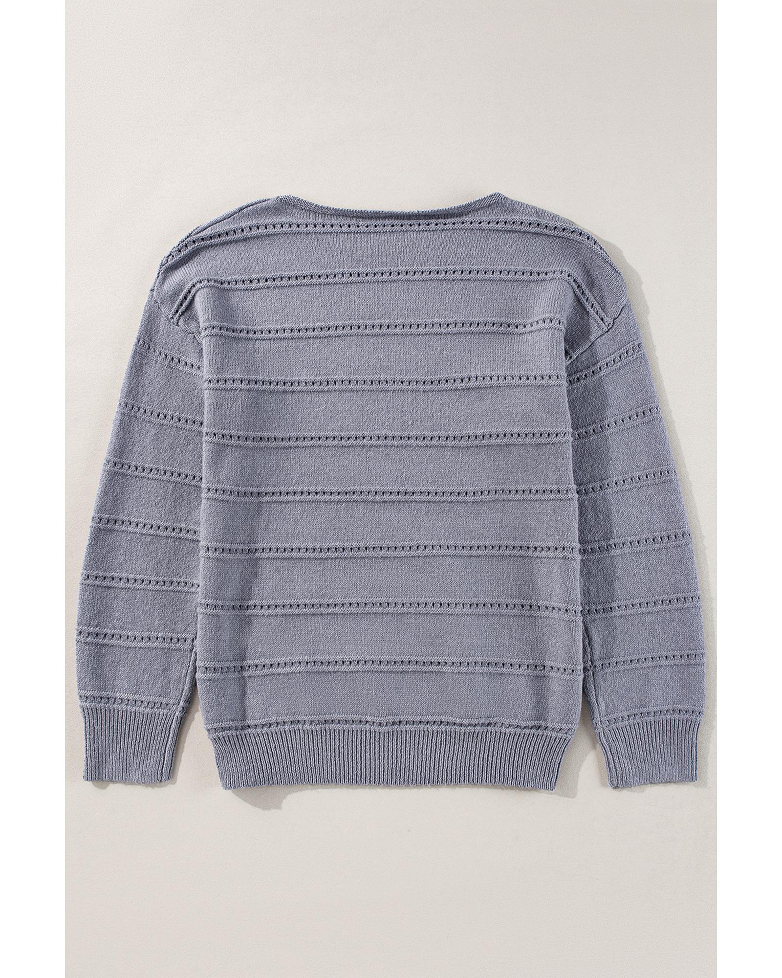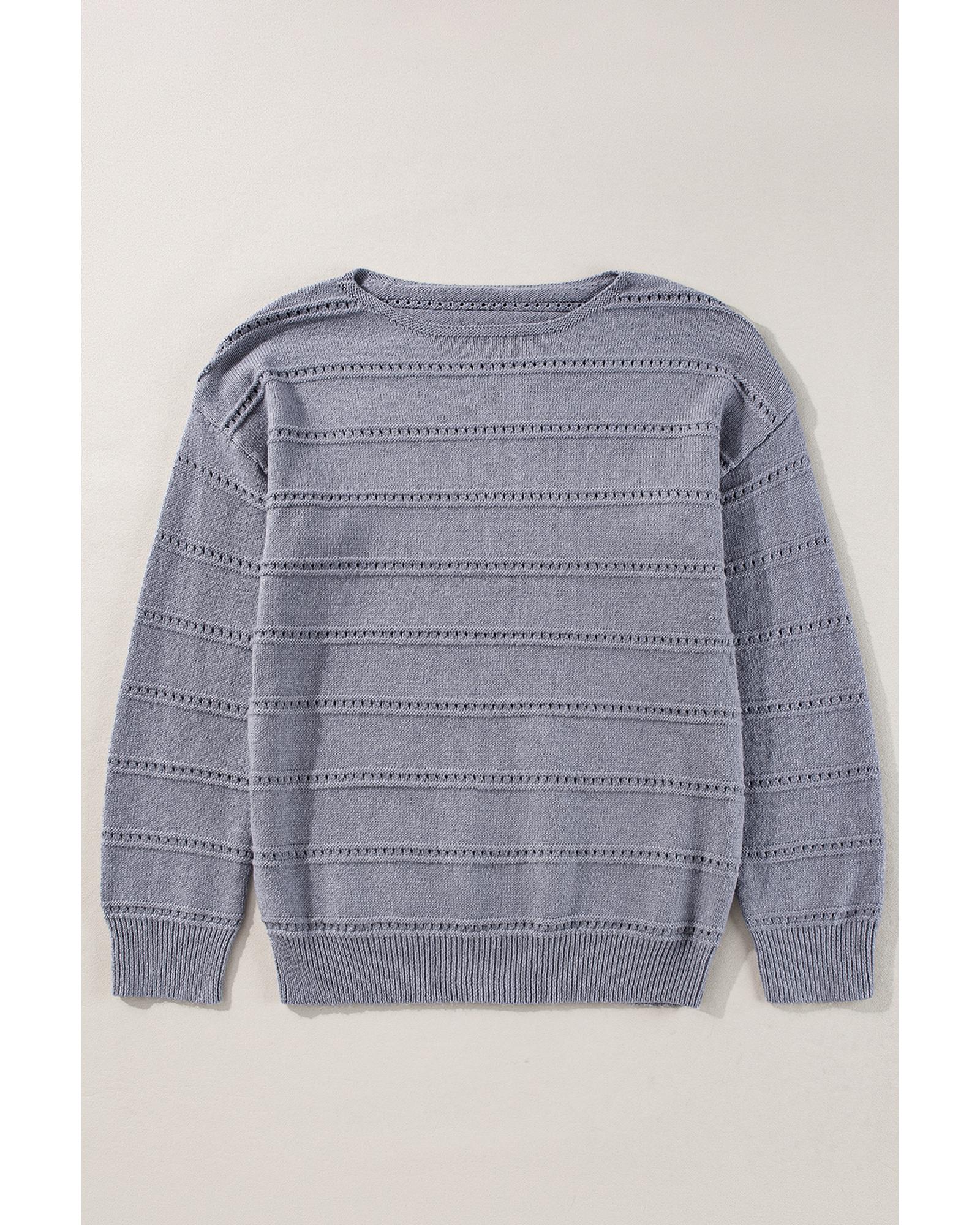 Light Grey Boat Neck Drop Shoulder Pointelle Knit Sweater – L