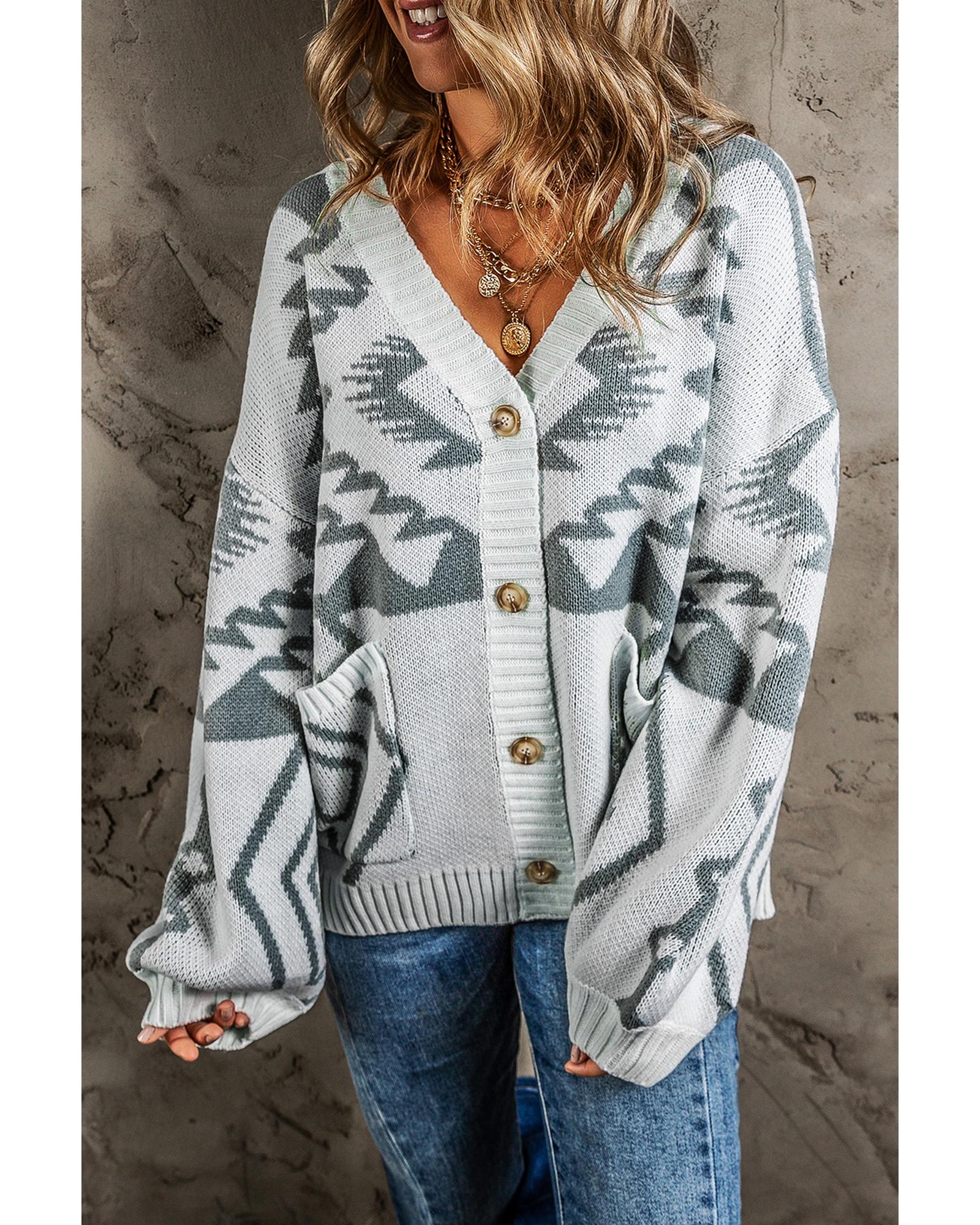 Light Grey Geometric Pattern Ribbed Trim Button-Up Cardigan – S