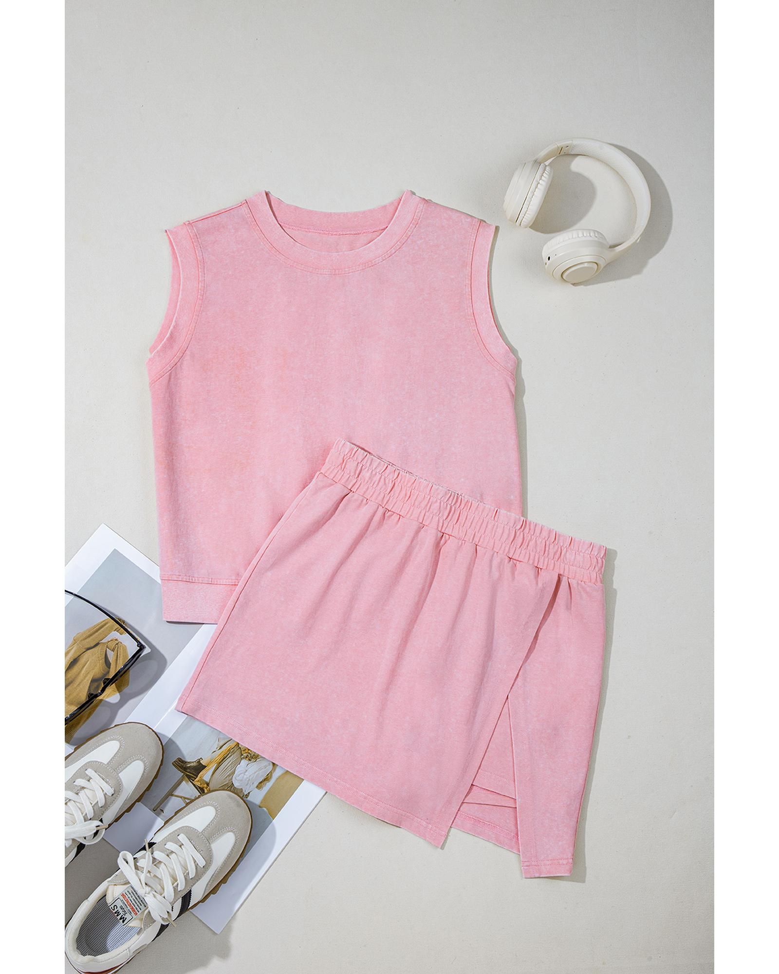 Light Pink 2 Pieces Mineral Wash Cotton Tank Top Lined Split Skirt Set – S