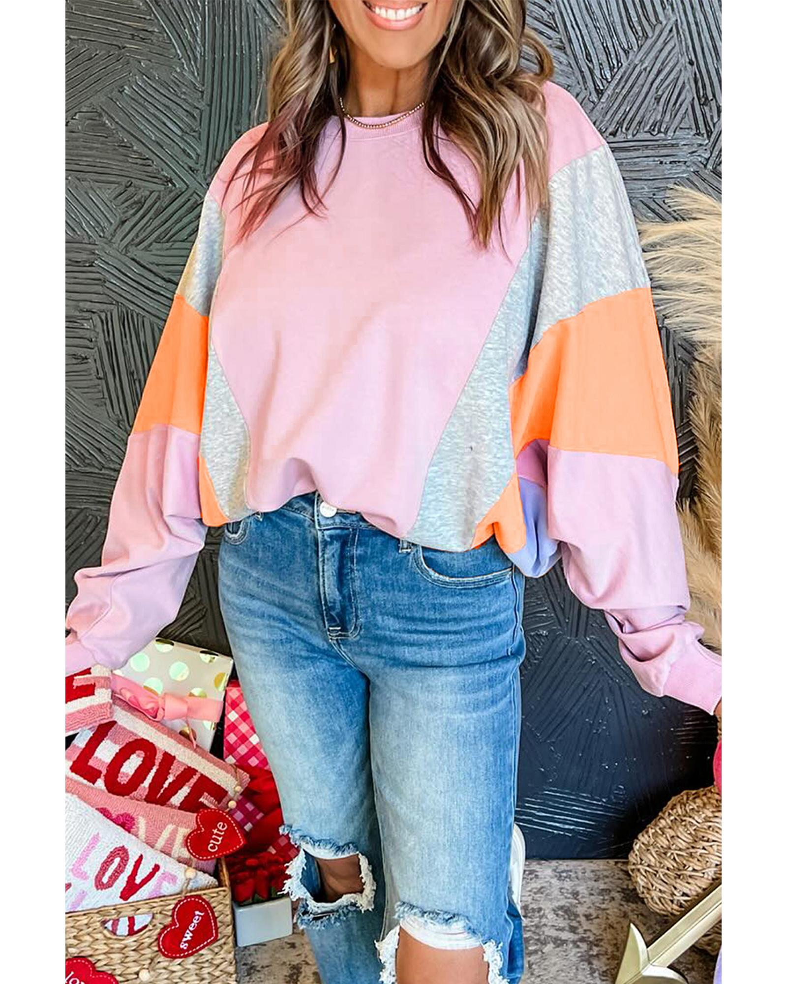 - Light Pink Color Block Batwing Sleeve Loose Fit Sweatshirt