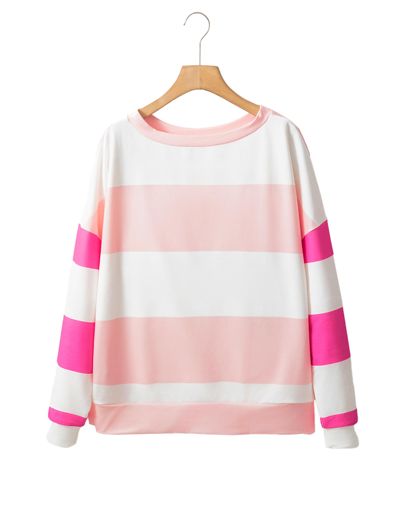 - Light Pink Colorblock Striped Drop Shoulder Long Sleeve Top