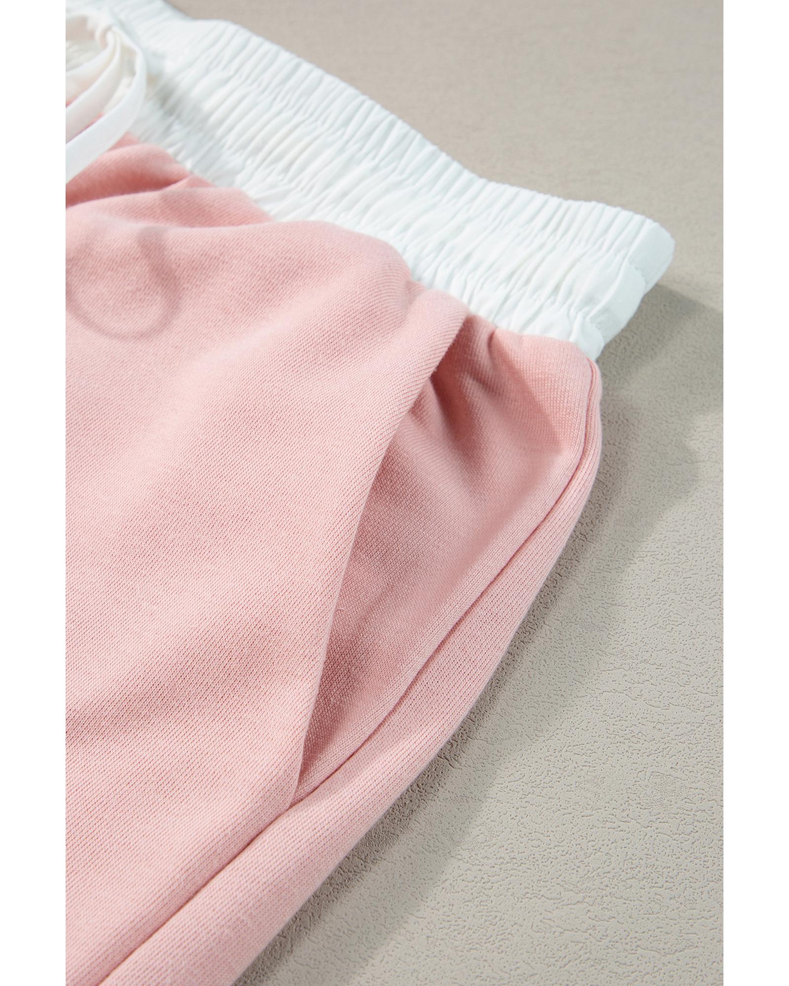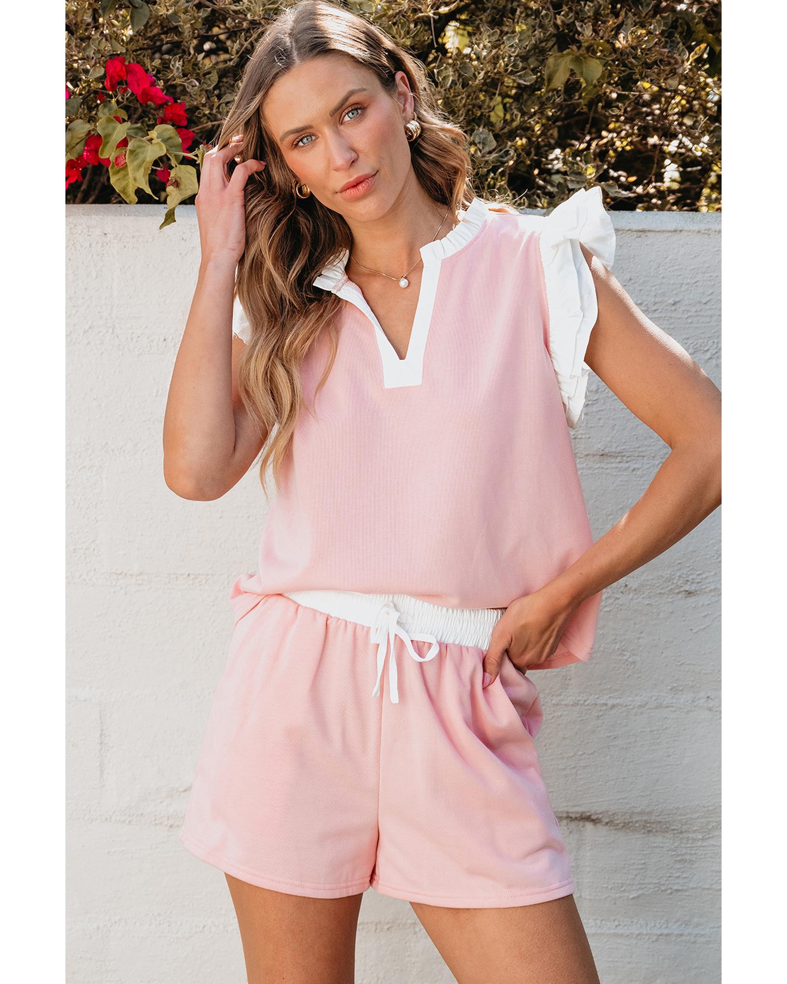 Light Pink Contrast Trim Ruffled Top and Drawstring Shorts Set – L