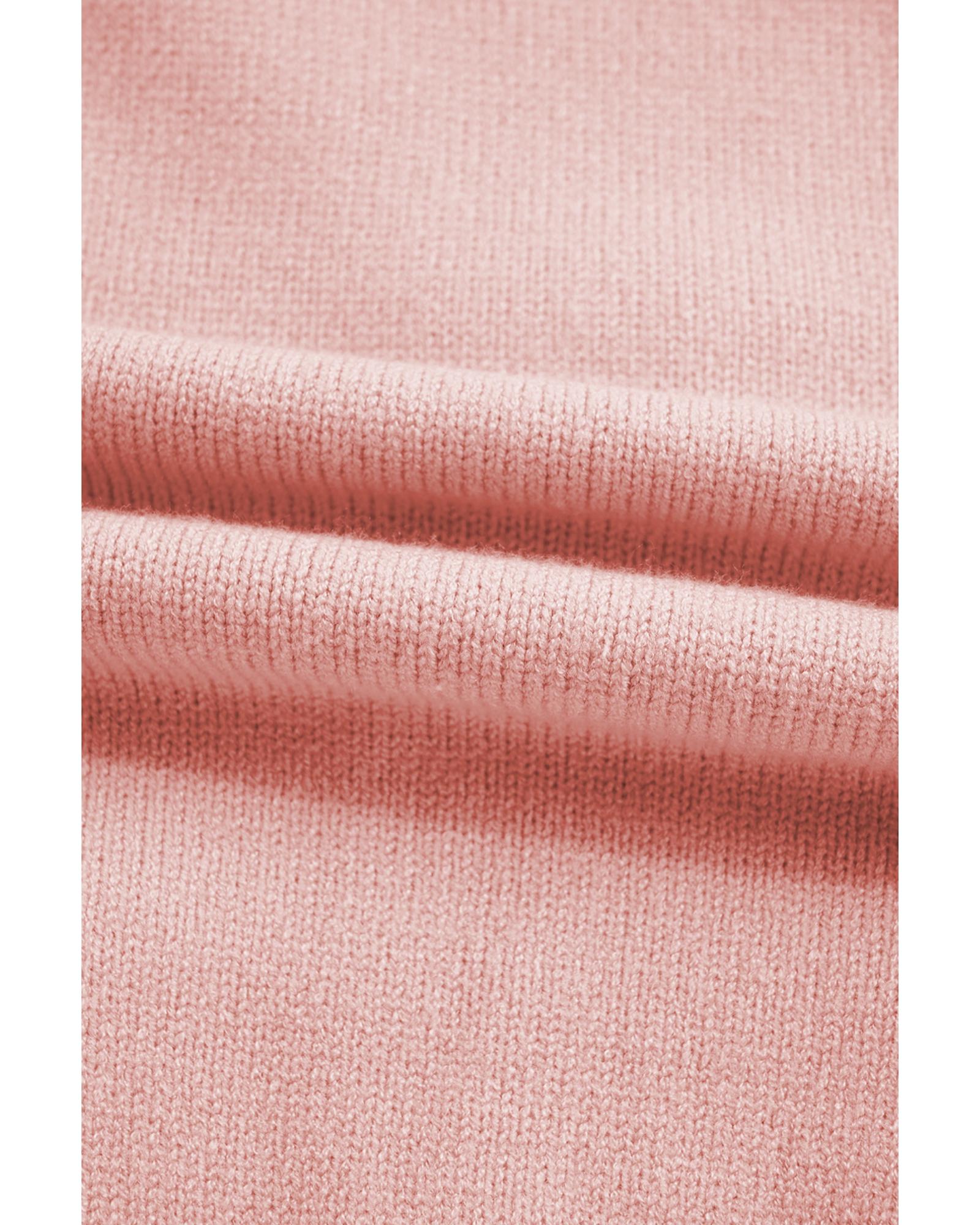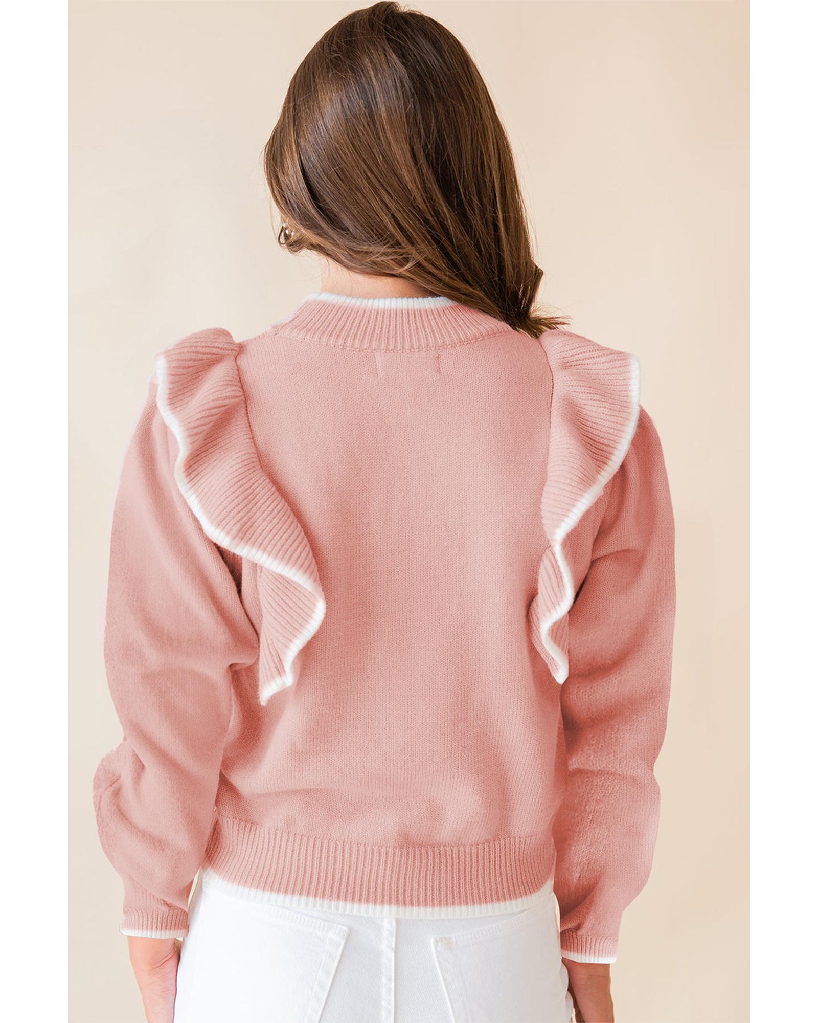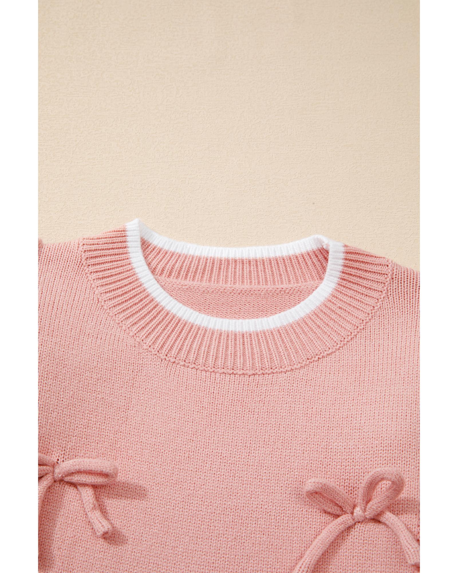 Light Pink Ruffled Bowknot Ribbed Trim Long Sleeve Sweater – L