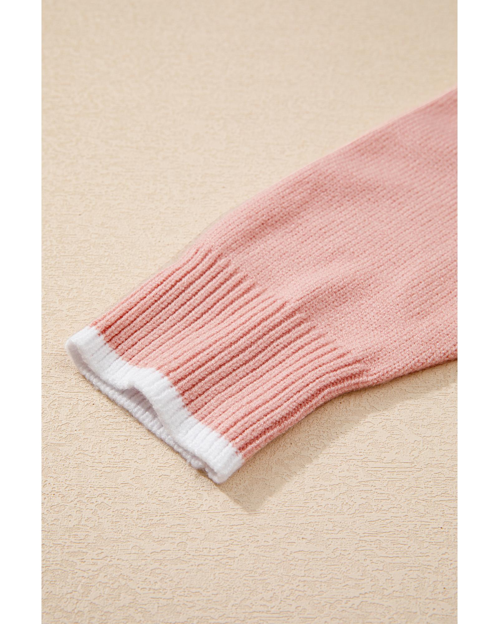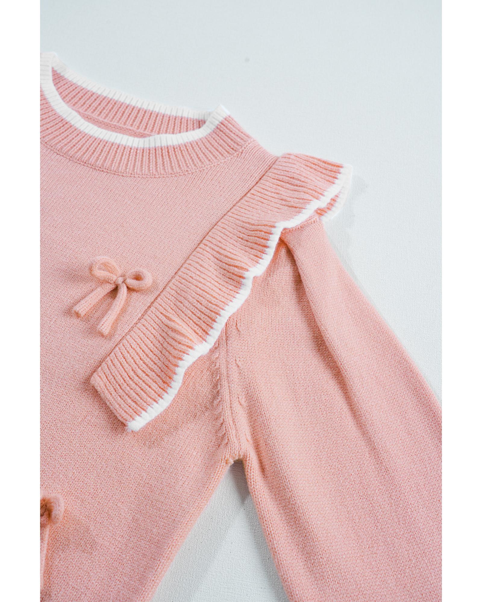Light Pink Ruffled Bowknot Ribbed Trim Long Sleeve Sweater – S