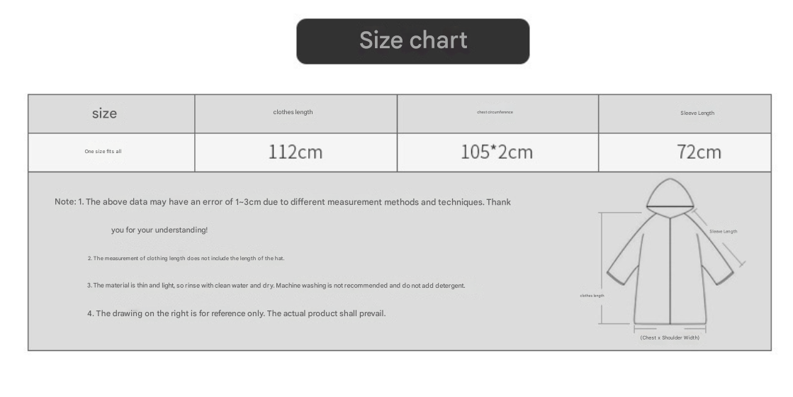 • Extended Length & Coverage: Features a generous long cut (approx. 112cm / 44″ length) and wide design (approx. 62″ width / 210cm chest circumference) providing ample coverage, even potentially over a small backpack.