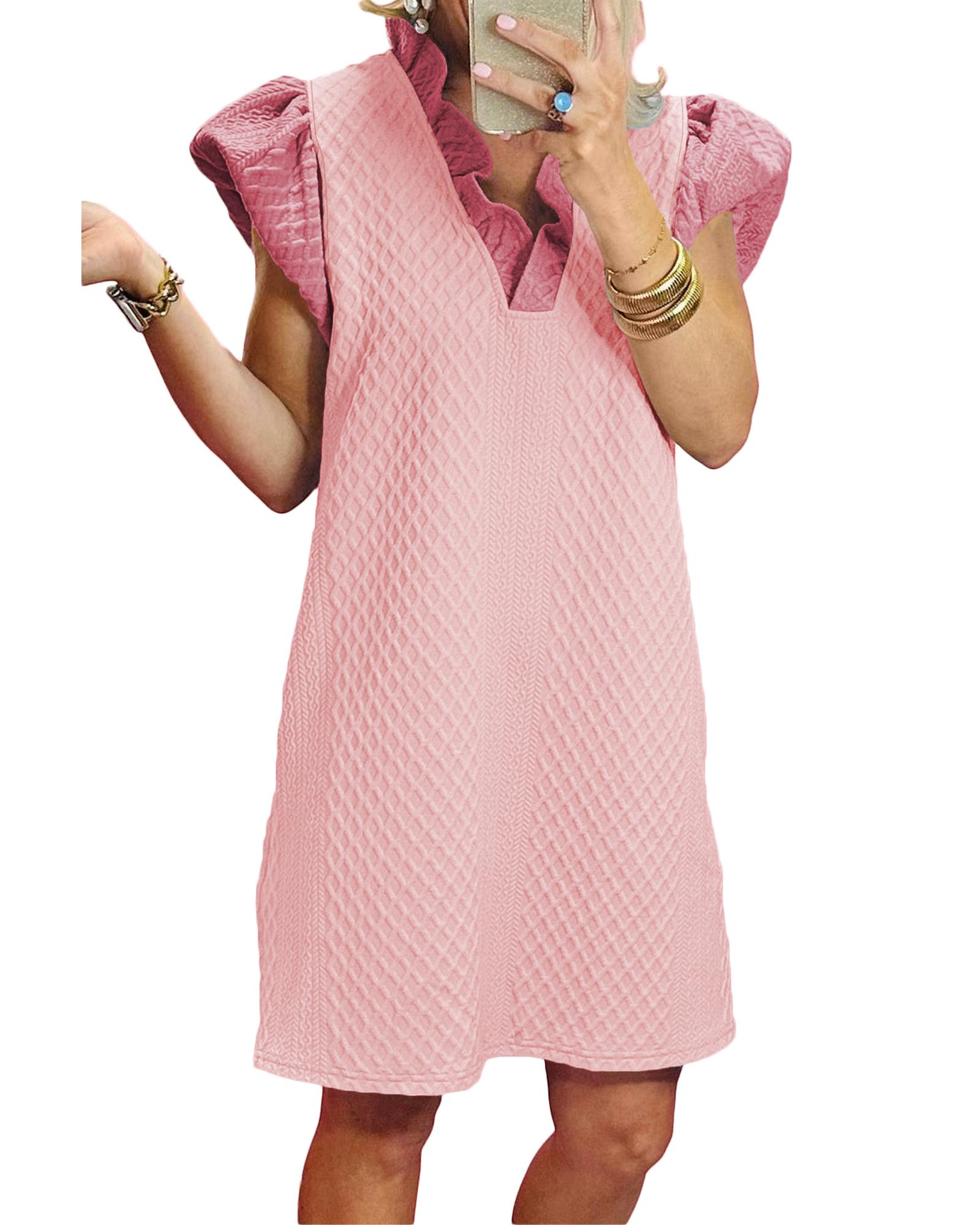 Light Pink Textured Puff Sleeve Ruffled V Neck Shift Mini Dress – L