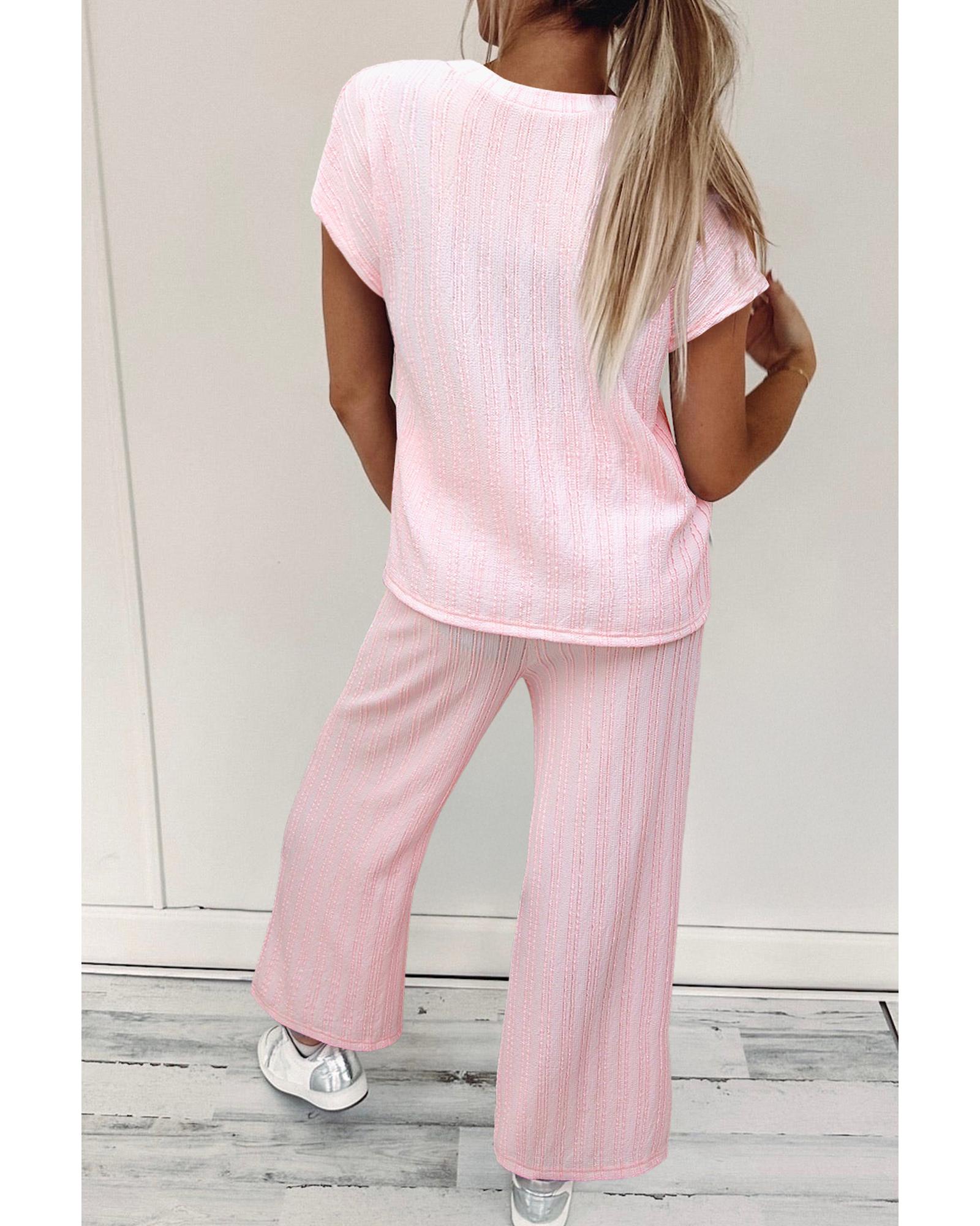 - Light Pink Textured Short Sleeve Henley Top and Pocketed Wide Leg Pants