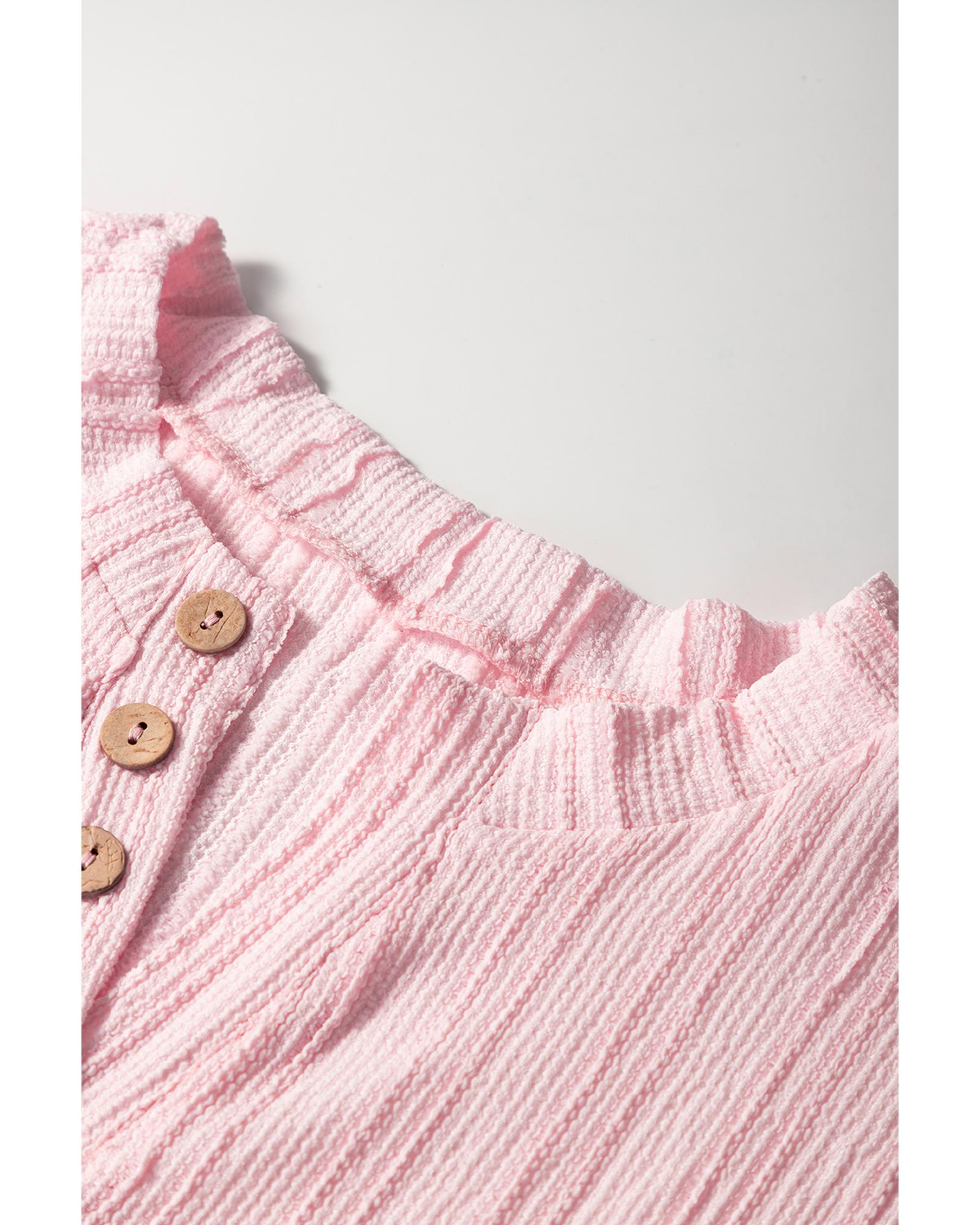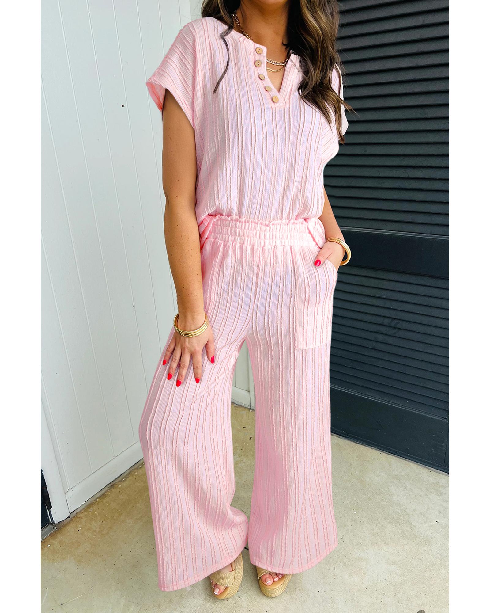 - Light Pink Textured Short Sleeve Henley Top and Pocketed Wide Leg Pants