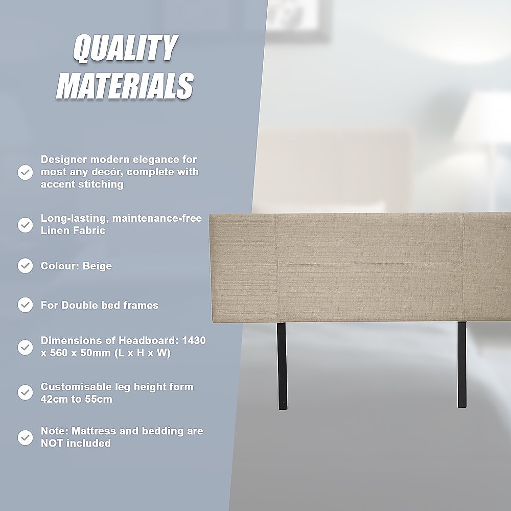 This headboard for standard Double-sized bed frames is created with quality materials, including easy-to-maintain Linen Fabric that will maintain its sophisticated look for many years to come. This particular model comes with elegant stitching accents that provide just the right level of understated pop. A neutral beige will blend seamlessly with a wide variety of bed frames and other bedroom furniture.