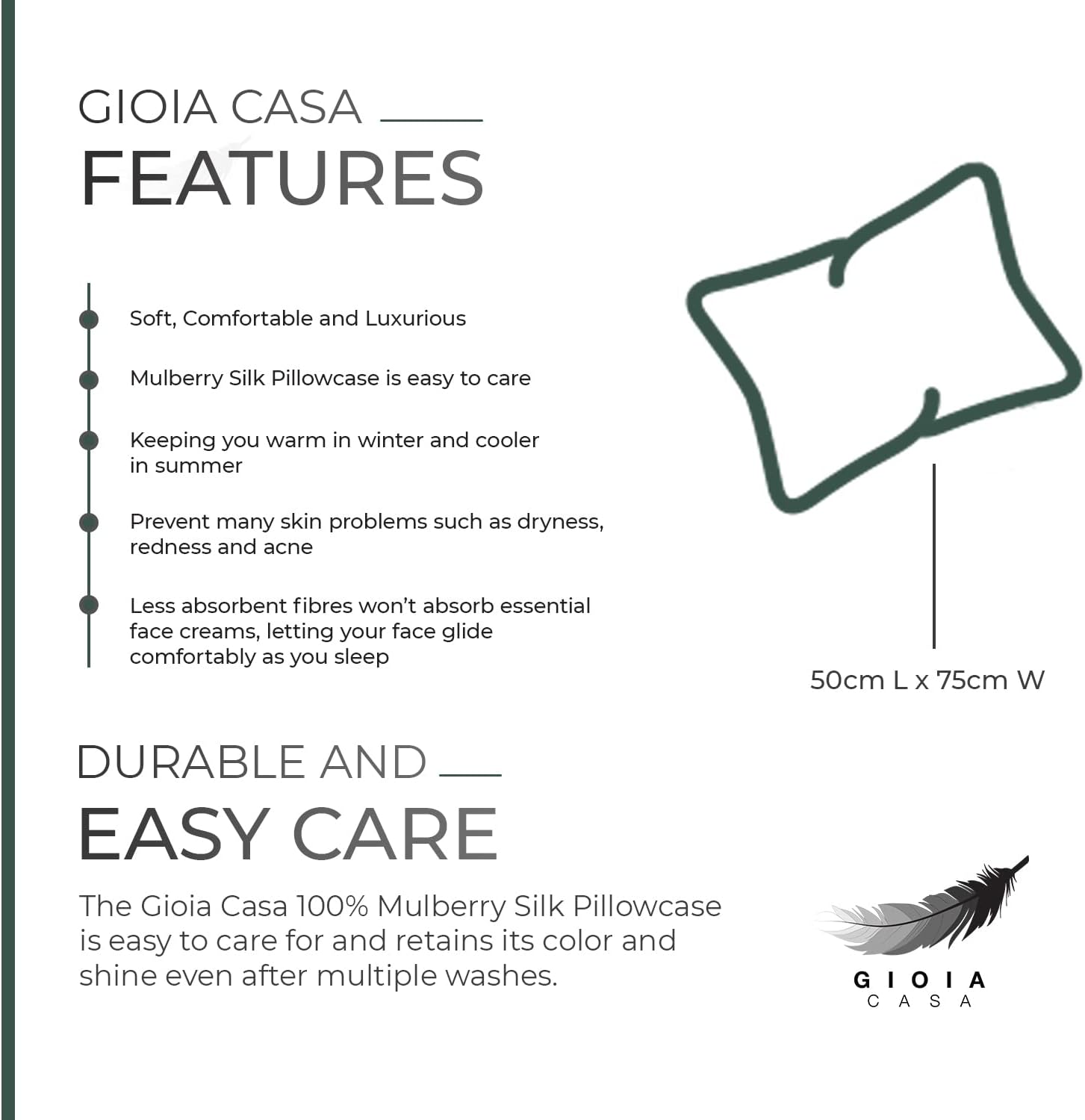 Gioia Casa Luxury Pillowcase – 100% Pure Mulberry Silk on Both Sides – Soft Anti-Wrinkle, Hypoallergenic, Washable Bed Pillowcases – Premium Pillow Cover for Hair and Skin Protection