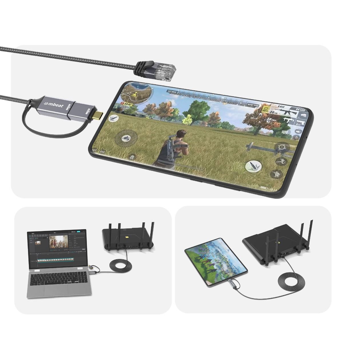 The mbeat Tough Link 2-in-1 USB USB-C to RJ45 Gigabit Ethernet Cable combines dual connectivity, durable design, and high-speed performance for seamless wired network access. Its perfect for professionals, gamers, and anyone needing reliable internet on USB-A and USB-C devices.