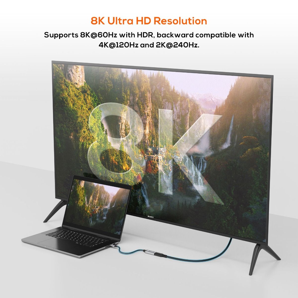 Supports up to 8K@60Hz resolution for immersive visuals, with backward compatibility for 4K@120Hz and 2K@240Hz. Dynamic HDR enhances image quality with vivid colours and sharp contrast, providing a lifelike viewing experience. Note: MacBooks are limited to 4K HDMI output due to hardware constraints and power efficiency priorities.