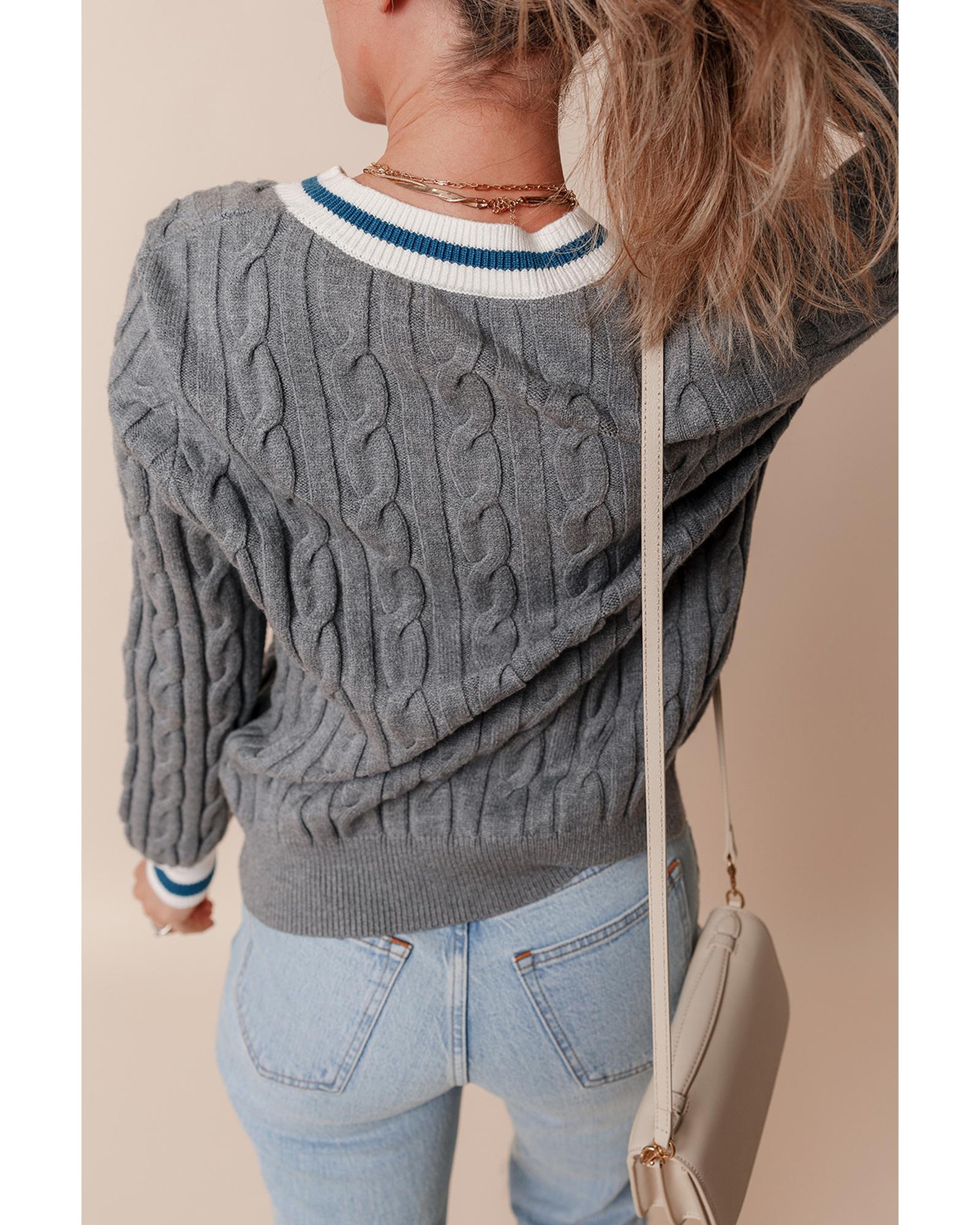 Medium Grey Color Contrast Ribbed Edge Cable Knit V Neck Sweater – M