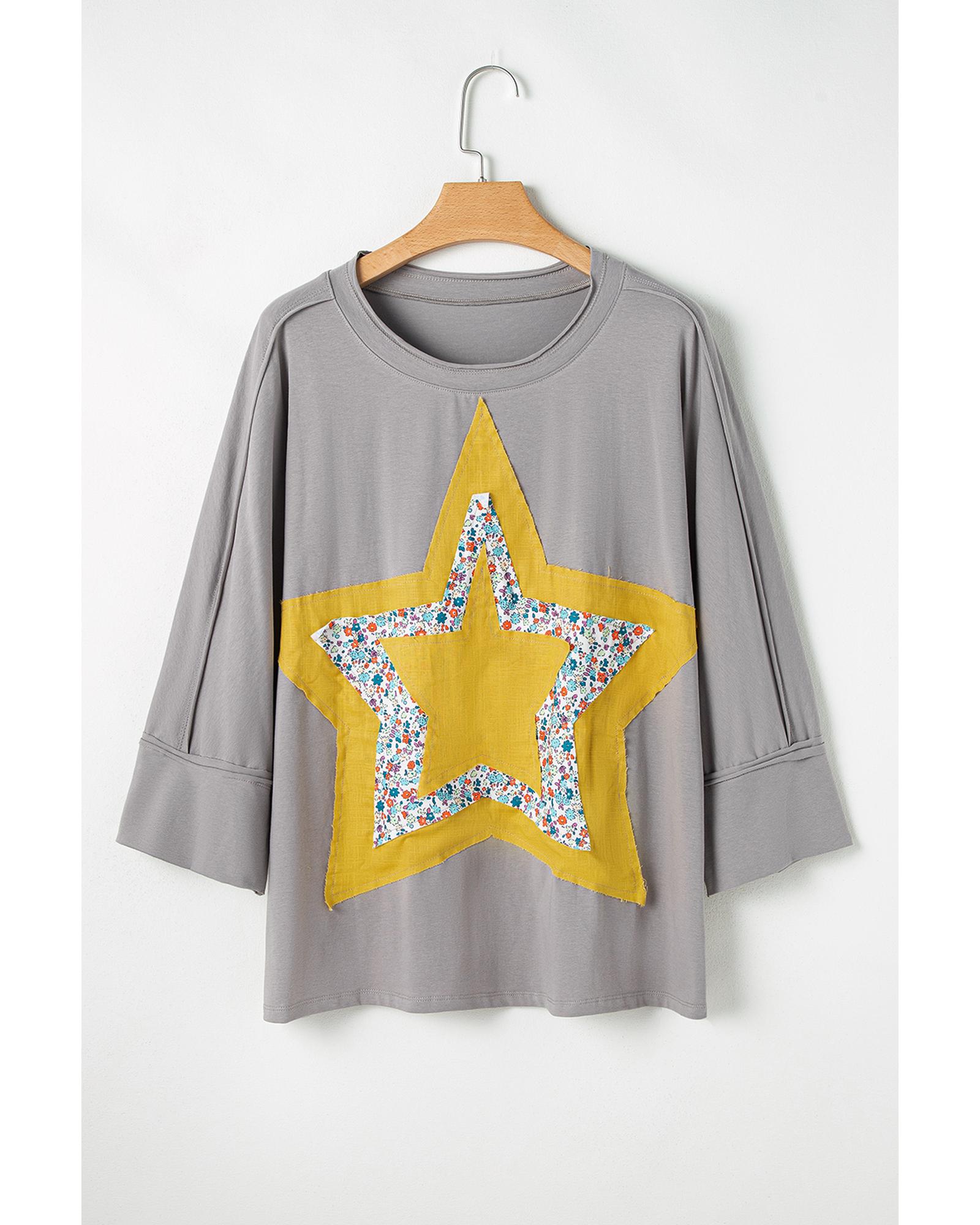 Medium Grey Floral Star Patched Pattern 3/4 Sleeve Plus Size Top – 3X