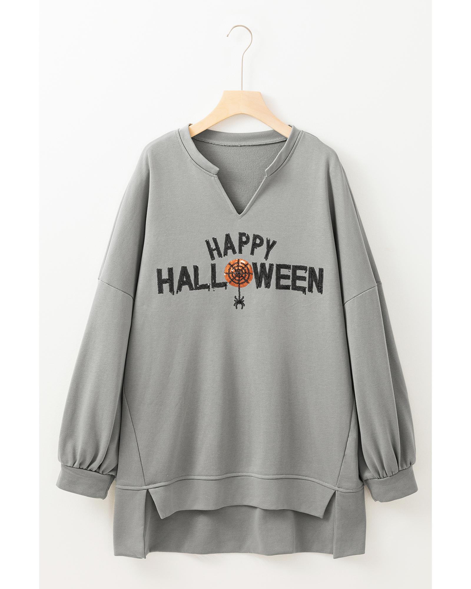 Medium Grey Sequin Happy Halloween Graphic Notched Neck Long Sleeve Loose Top – M