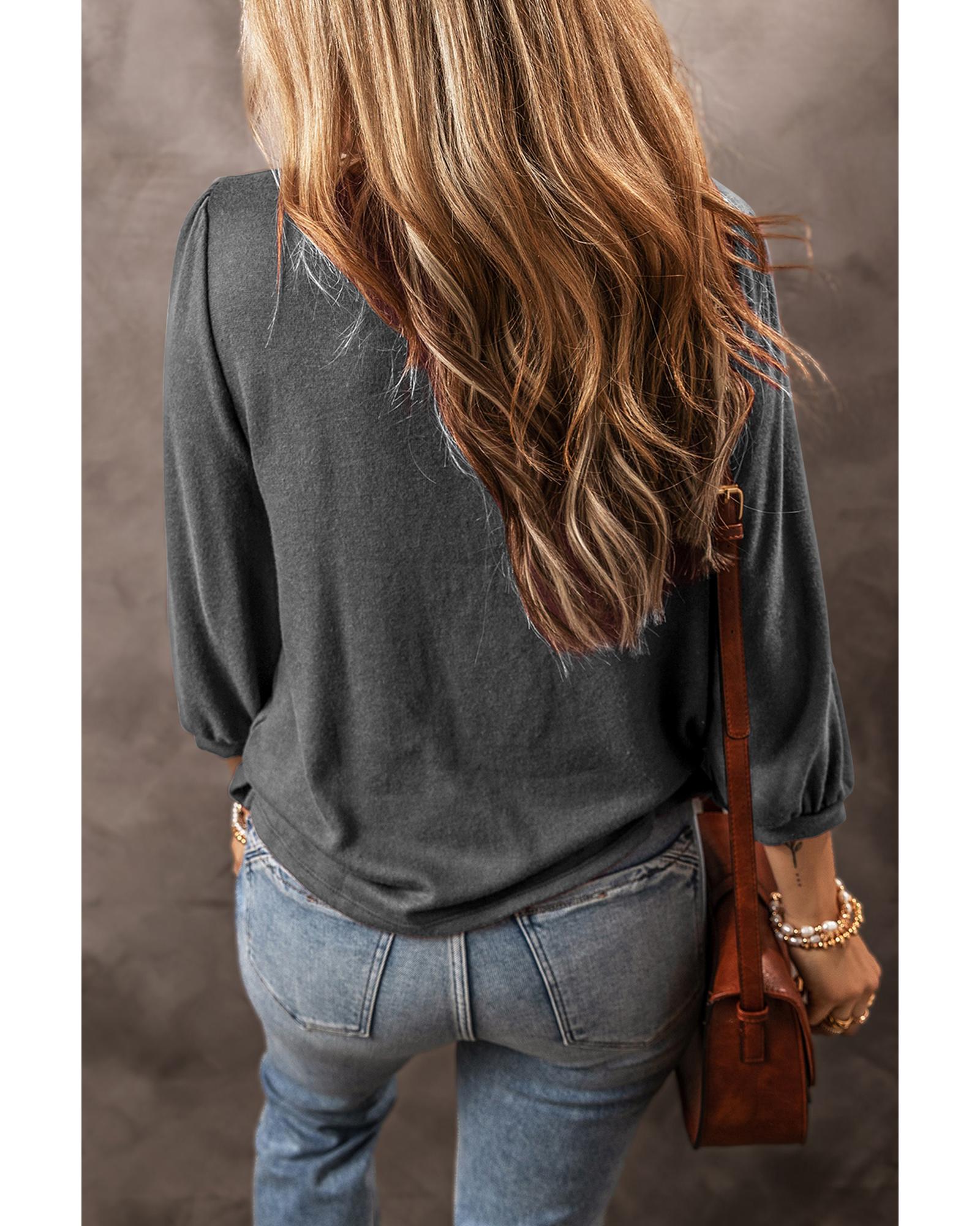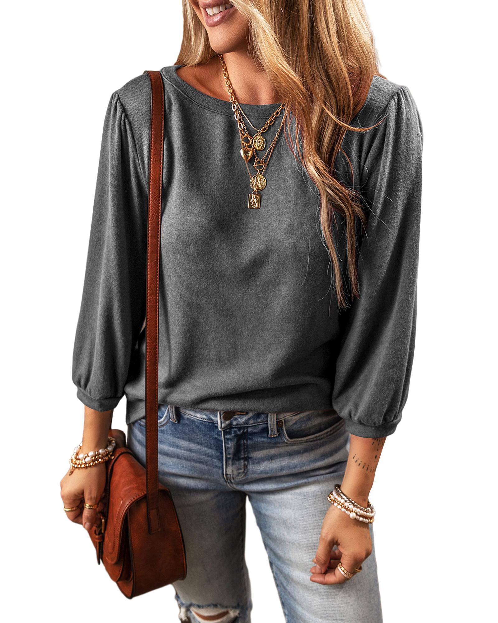 Medium Grey Solid Color 3/4 Sleeve Round Neck Blouse – M
