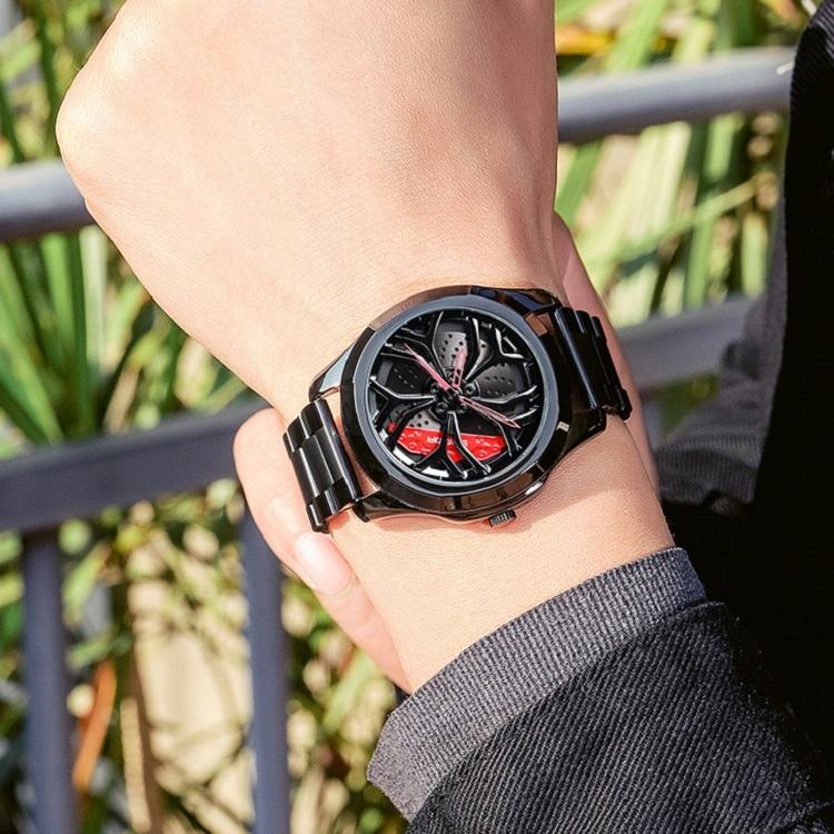 Men Casual Steel Band Quartz Watch – P1065 Wheel Series – Black Red