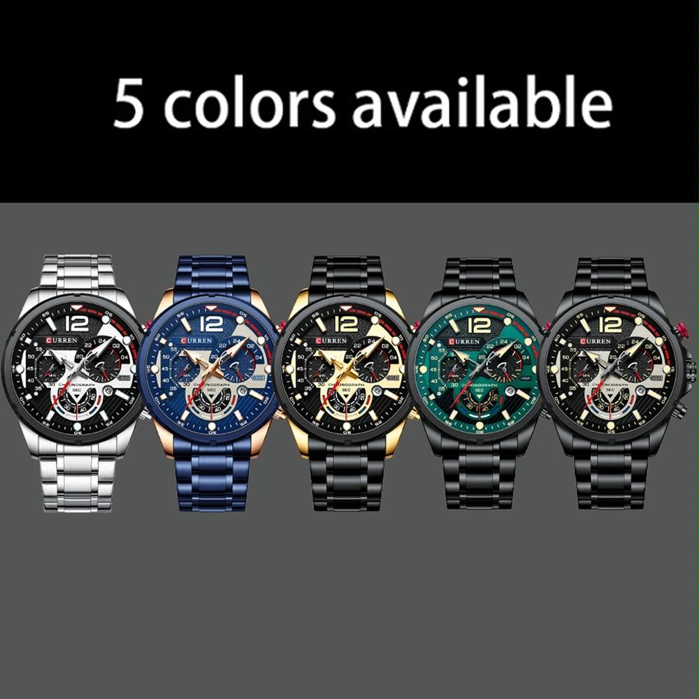 Men Quartz Watch with Six-hand Steel Strap and Calendar – Black Shell Green