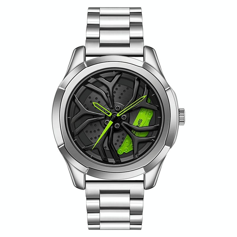 Men Steel Belt Quartz Watch with 3d Hollow out Wheel Design – Silver Green