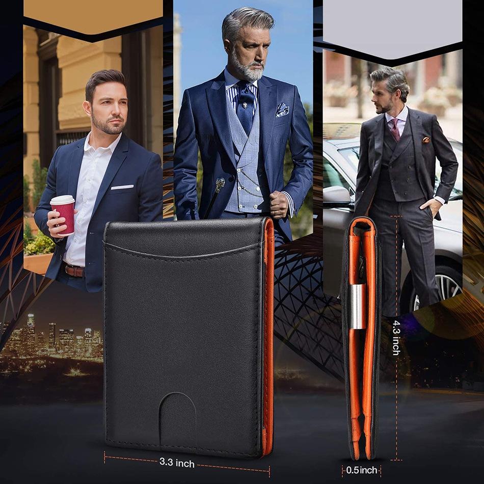 Men Vintage Leather Rfid Wallet – Carbon Fiber Orange Inside