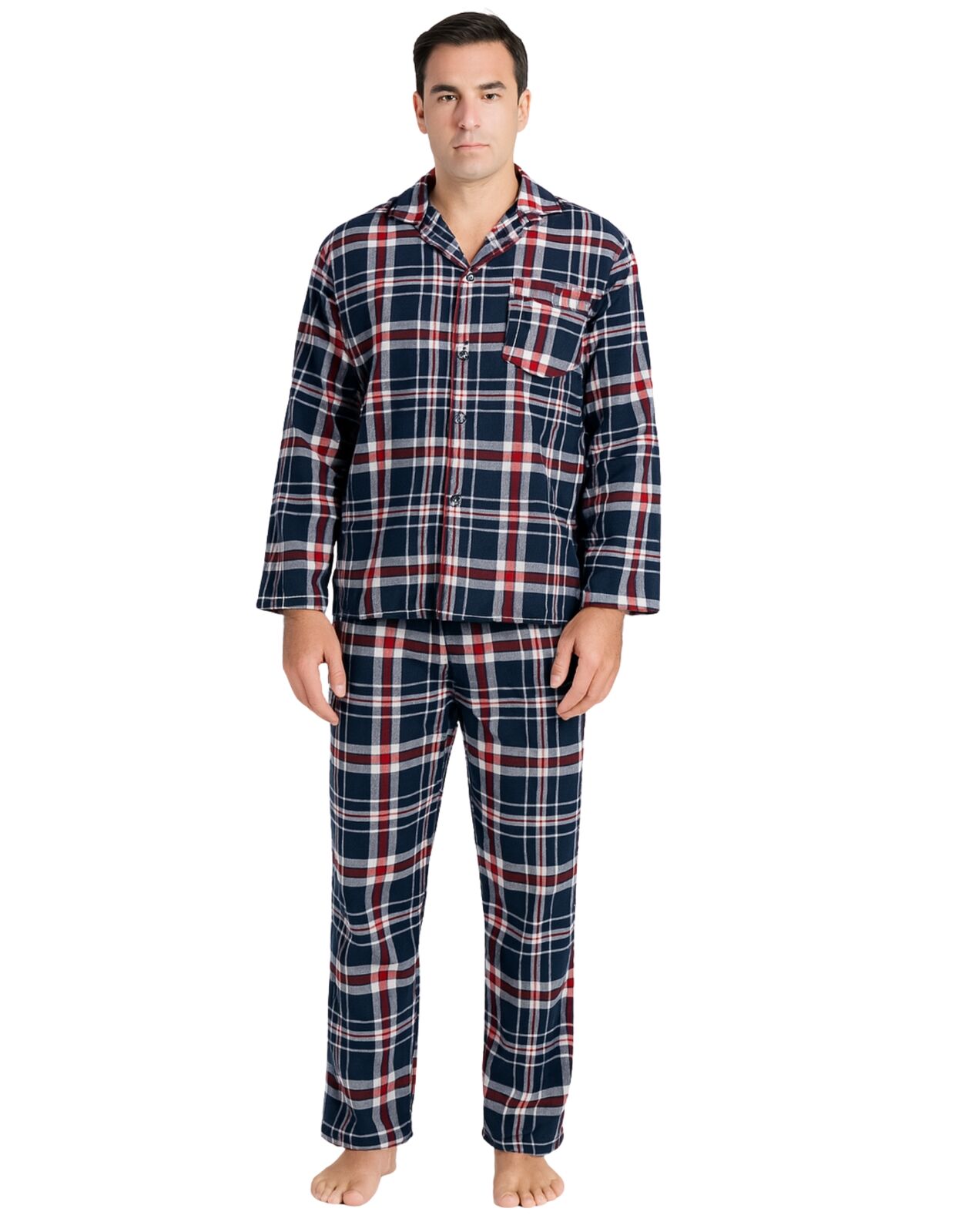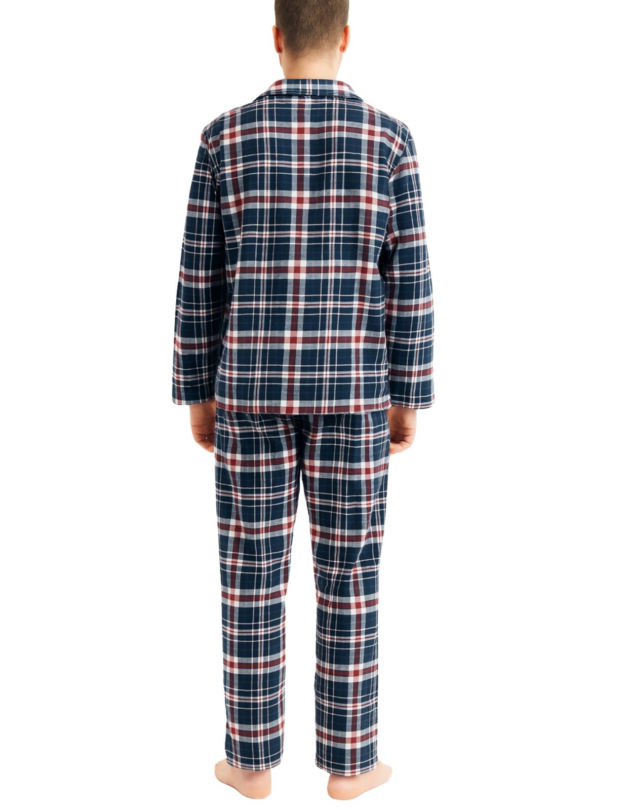 Mens Flannelette Pyjama Set Sleepwear Soft 100% Cotton PJs Two Piece – Navy/Red Check – S