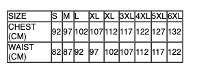 | SIZE | S | M | L | XL | XL | 3XL | 4XL | 5XL | 6XL |