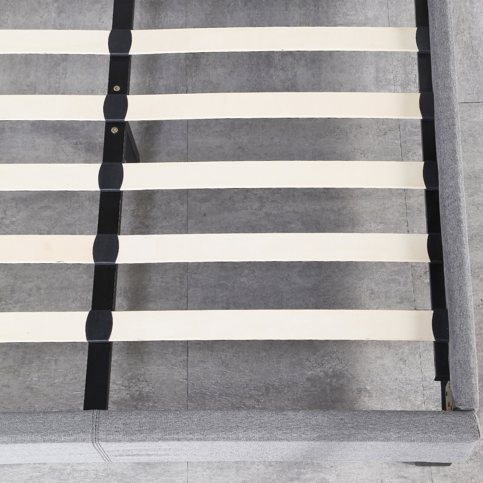 This bed frame and the complementary headboard is encased in a high-quality fabric upholstery with clean and smooth edges that complement the modern design and adds another layer of comfort to the bedroom experience.