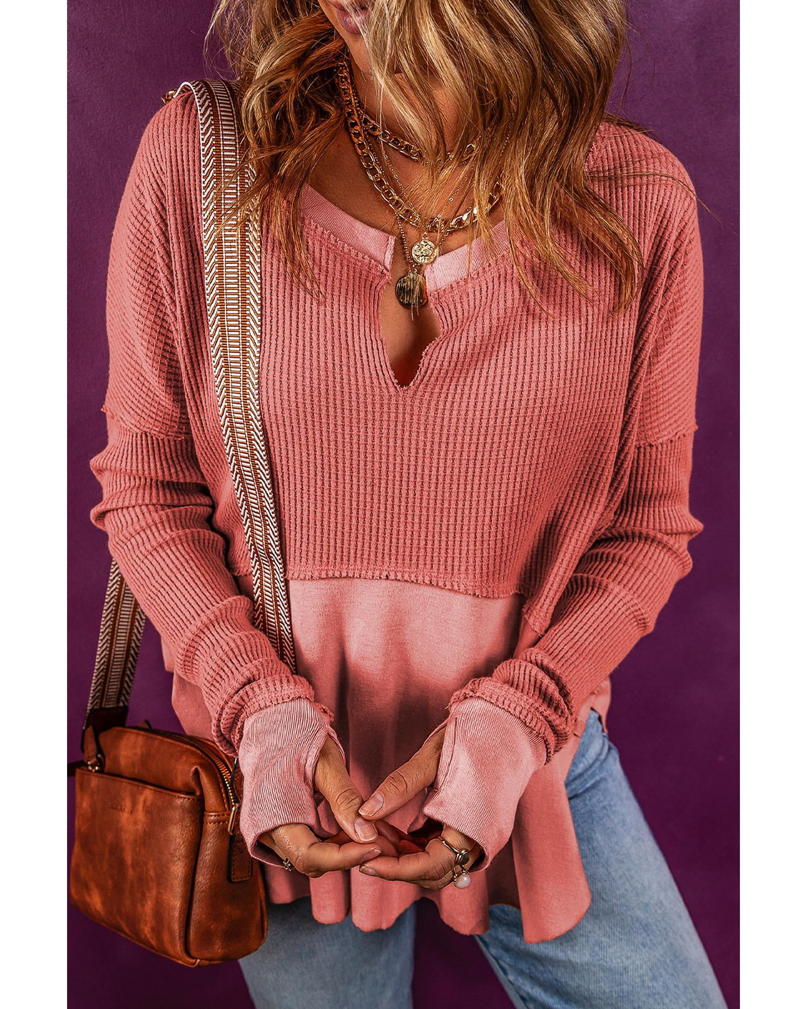 - Mineral Red Exposed Seam Slit Neck Waffle Knit Patchwork Top