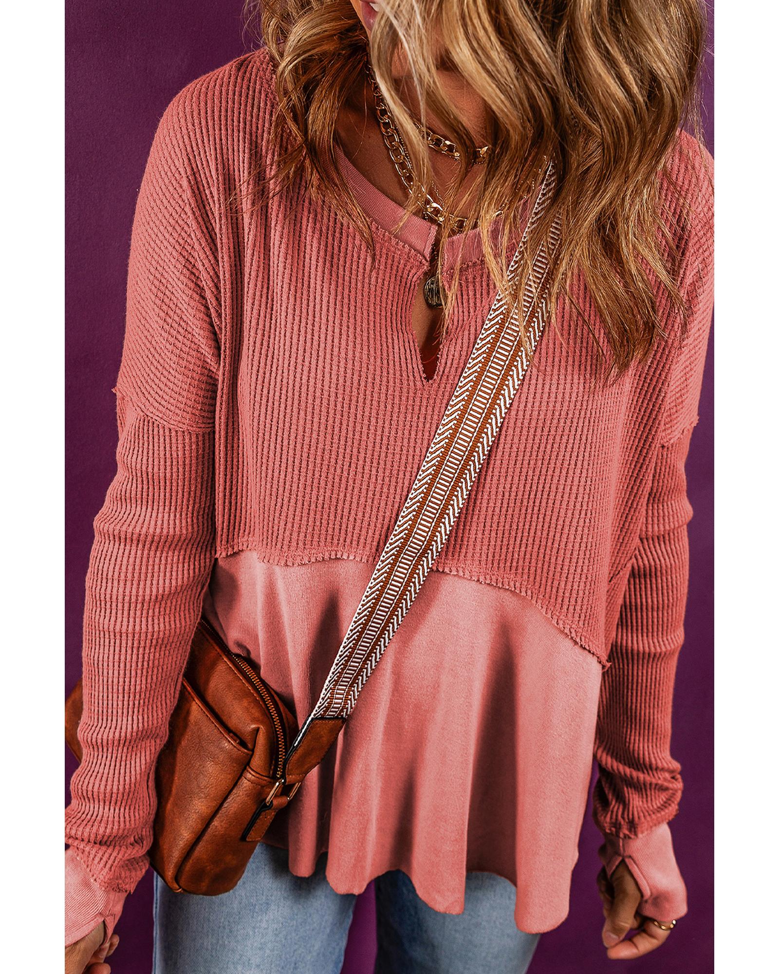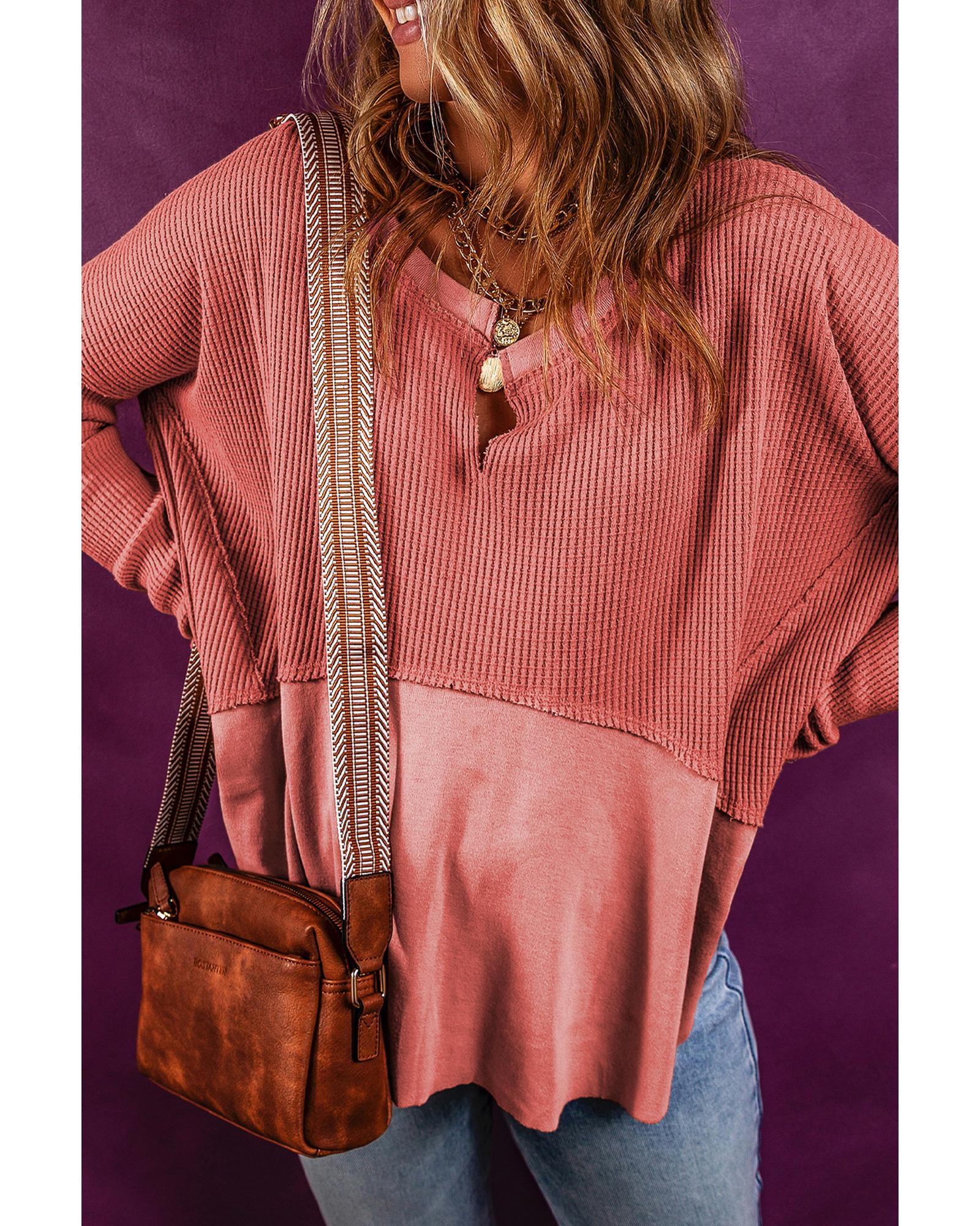 - Mineral Red Exposed Seam Slit Neck Waffle Knit Patchwork Top