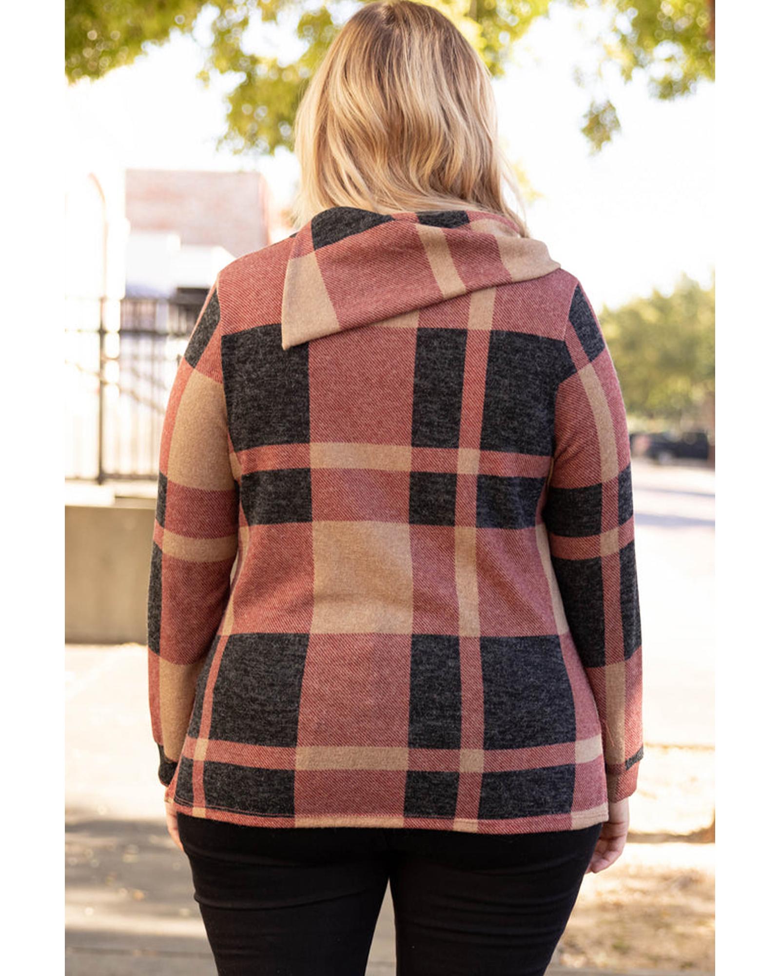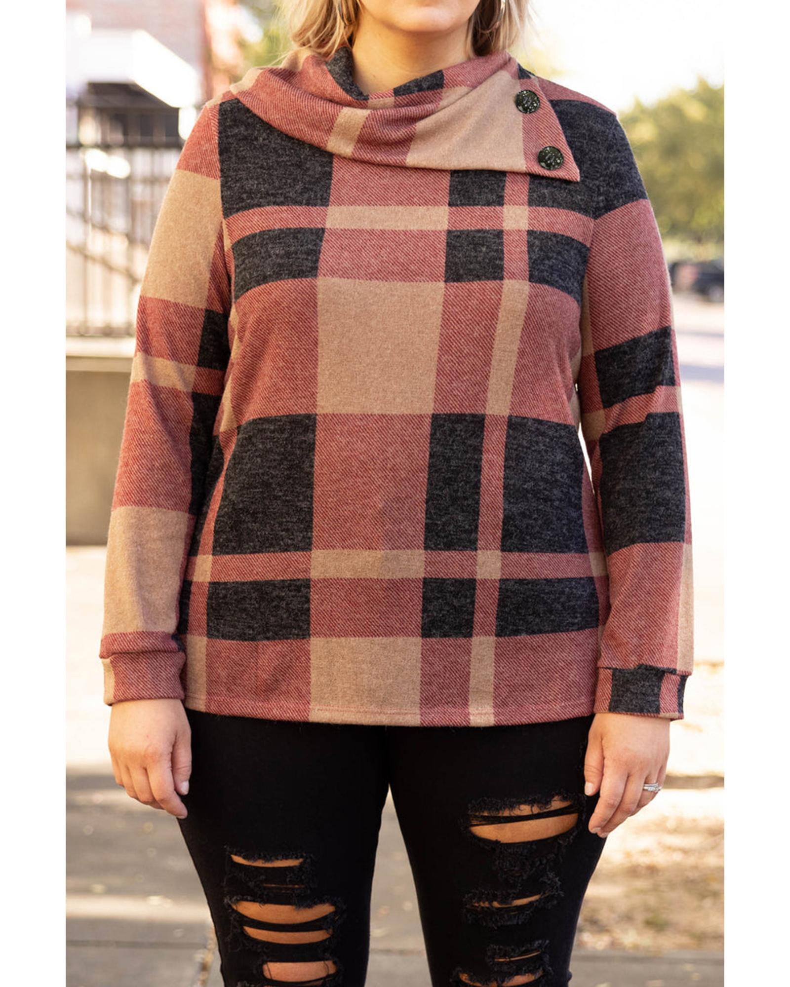 Mineral Red Plus Size Plaid Print Button Decor Asymmetric Neck Top - 2X
