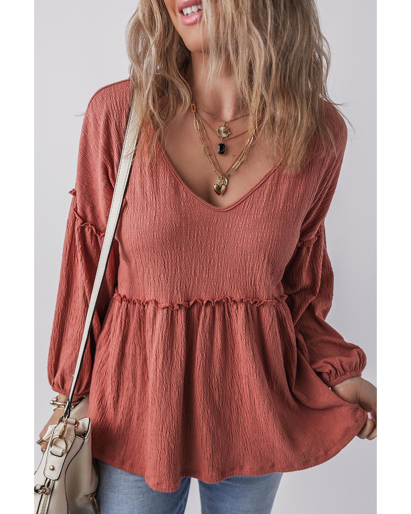 Mineral Red Solid Color Textured Frilled Trim V Neck Puff Sleeve Blouse – M