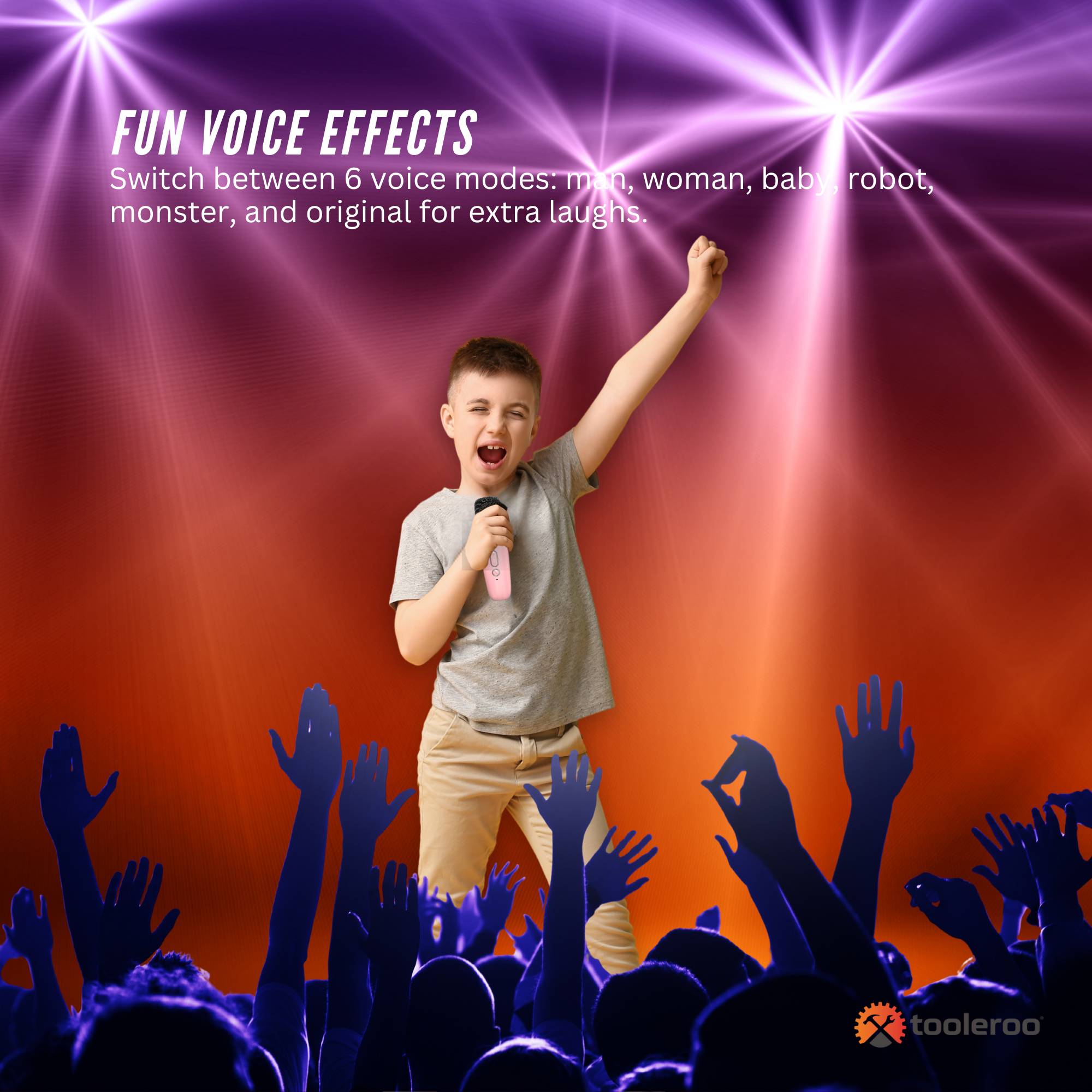 - Voice Effects: 6 sound modes (Man, Woman, Baby, Robot, Monster, Original)