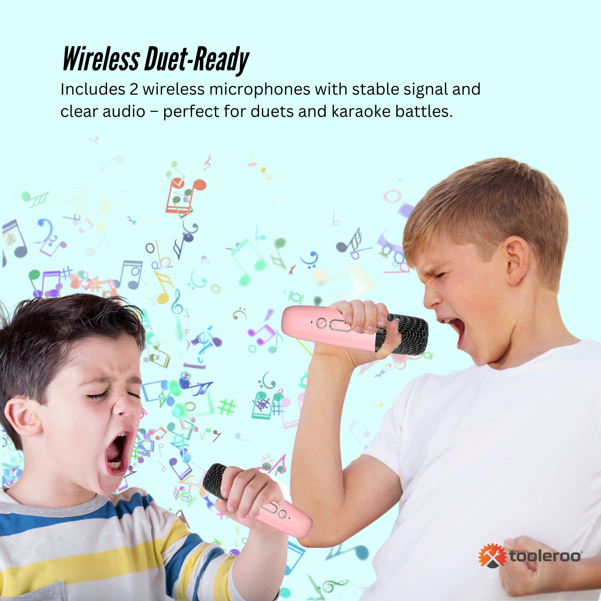 - Wireless Duet-Ready – Includes 2 wireless microphones with stable signal and clear audio – perfect for duets and karaoke battles.