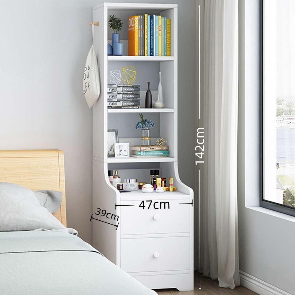 This modern minimalist bookcase bedside table features a pure warm white design, combining storage, display, and decorative functions. The upper section has four open storage shelves for placing books, decorative items, photo frames, and other objects, showcasing personal taste and style. The bottom section features two spacious drawers with matching round knobs, providing ample private storage space. The elegant curved side design adds a soft touch, and the top includes a hook for hanging bags, tapestries, or other items. This slim tall cabinet design doesn’t take up much space, making it especially suitable for small bedrooms, serving as the perfect combination of bookshelf, display cabinet, and bedside table, both practical and decorative.