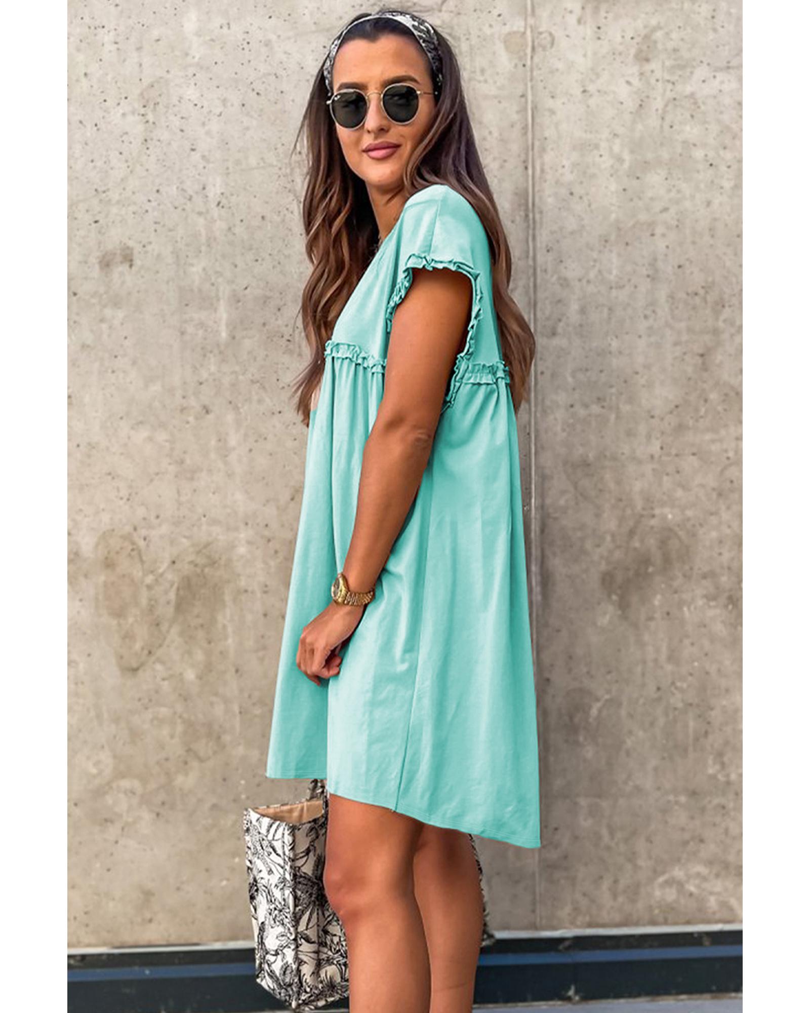 - Mint Green Frilled Trim Crew Neck Loose Fit Mini Dress