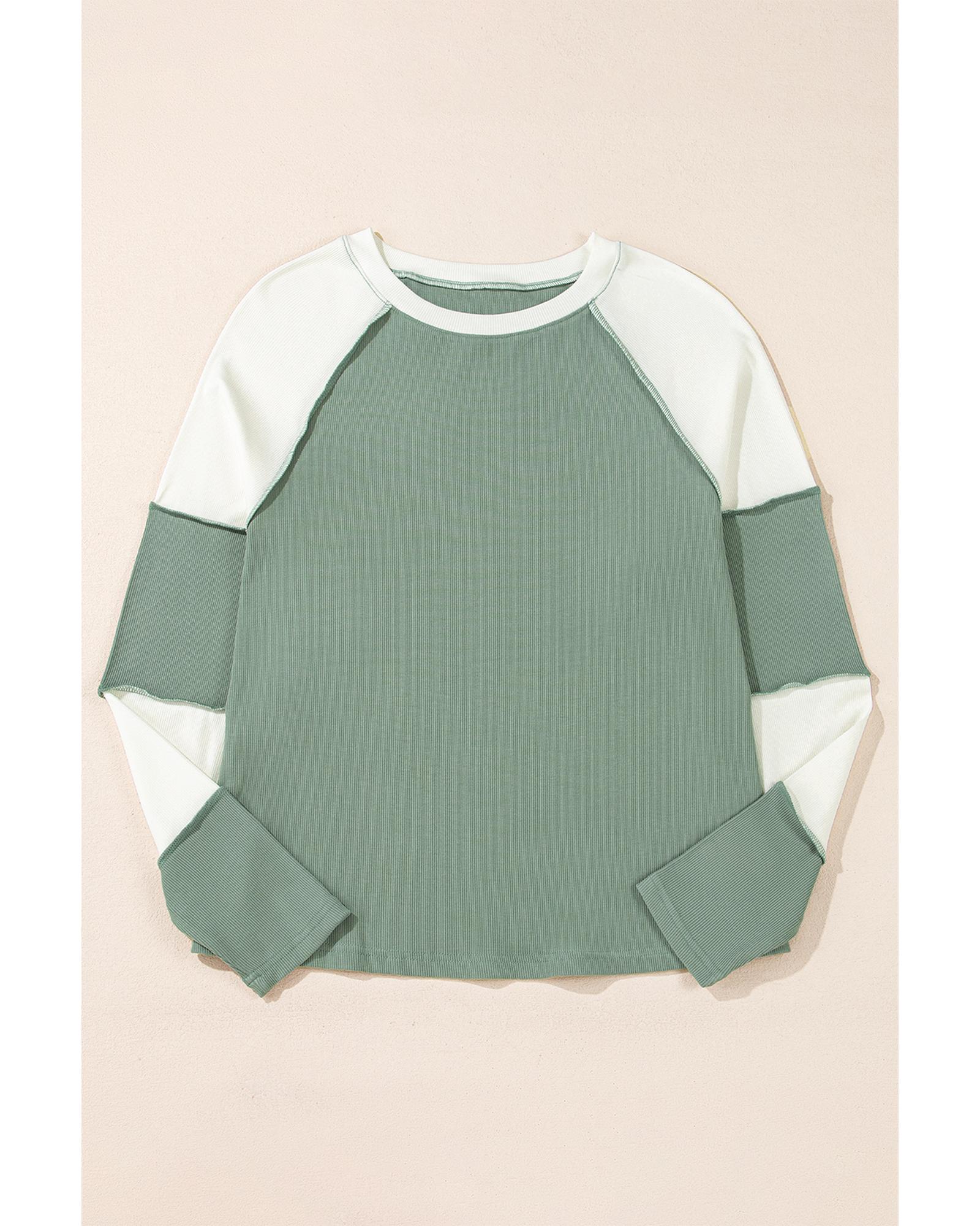 - Mint Green Ribbed Colorblock Patchwork Raglan Long Sleeve Top
