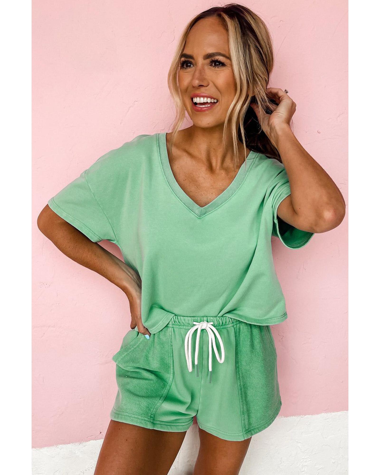 Mint Green V Neck Drop Shoulder Tee and Patchwork Drawstring Shorts Set – L
