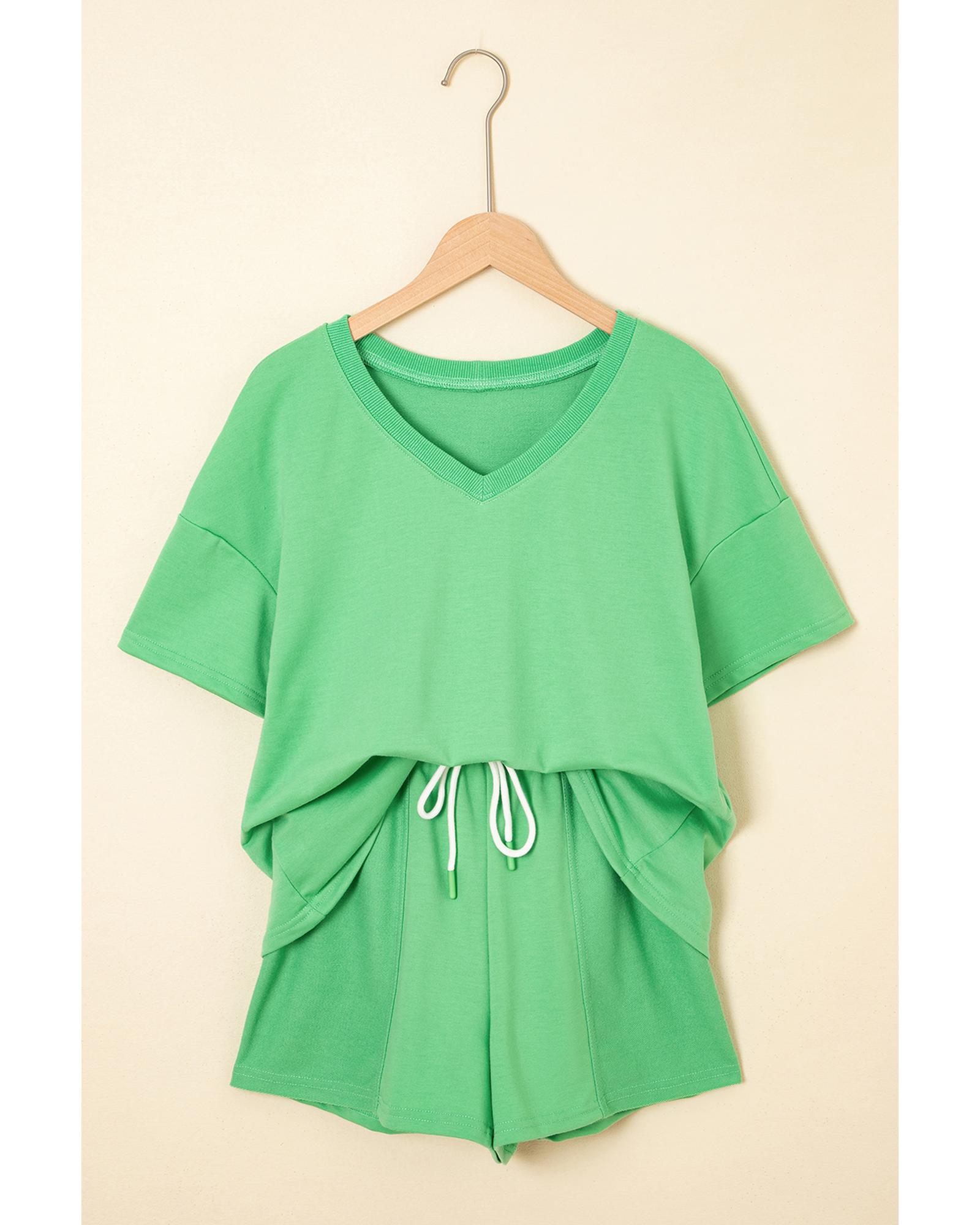 Mint Green V Neck Drop Shoulder Tee and Patchwork Drawstring Shorts Set – S