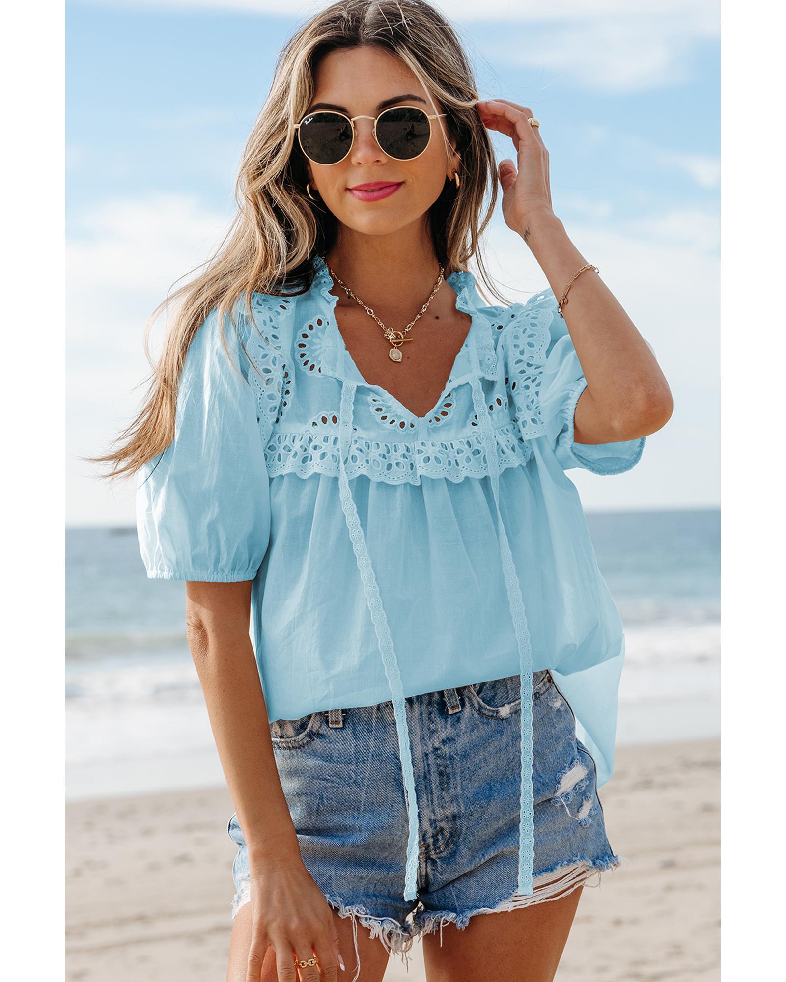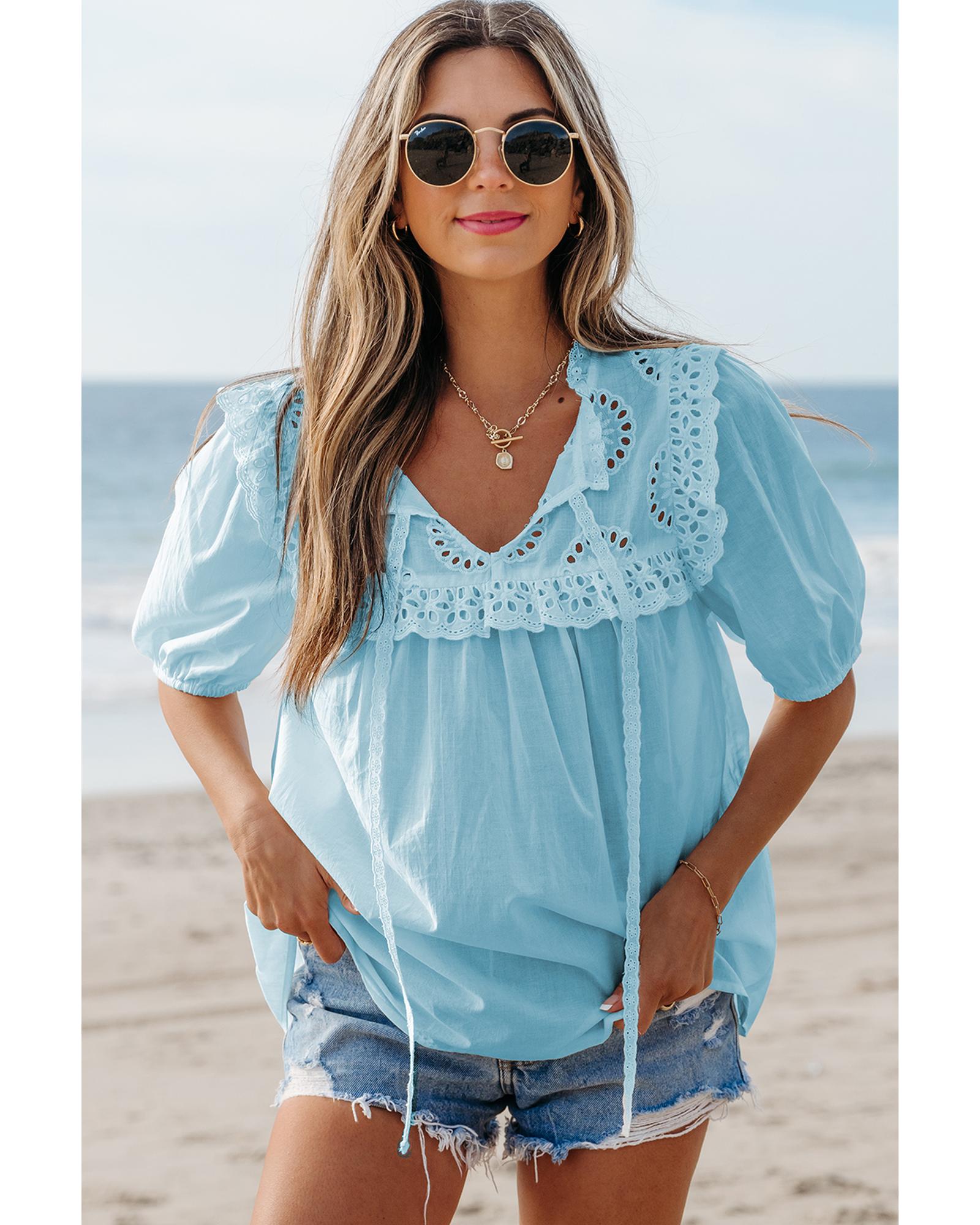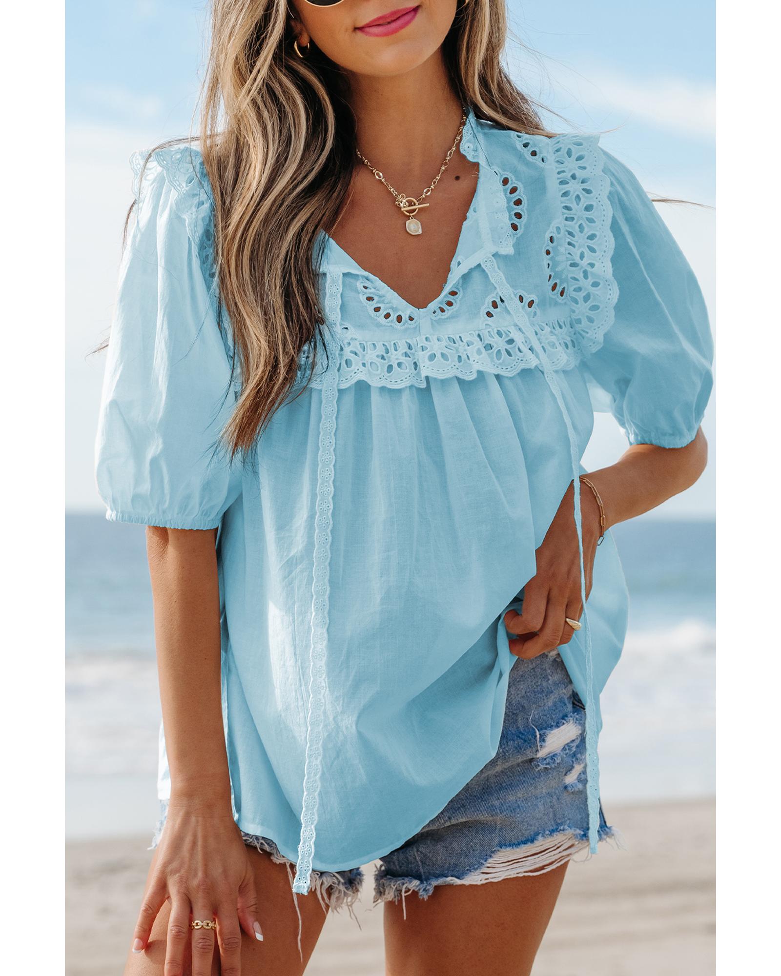 Mist Blue Embroidered Lace Patchwork Tie Neck Puff Short Sleeve Blouse – M